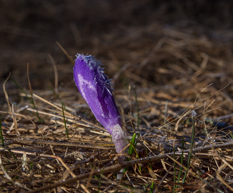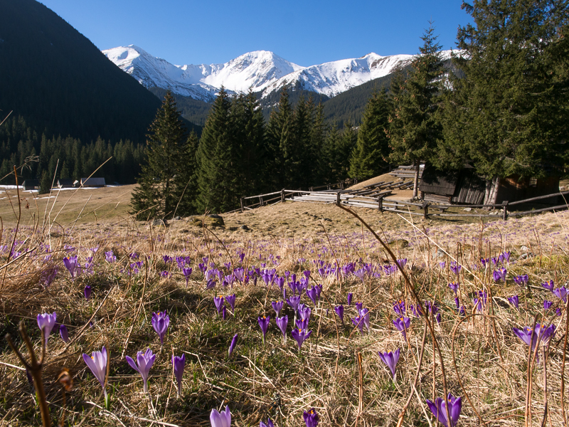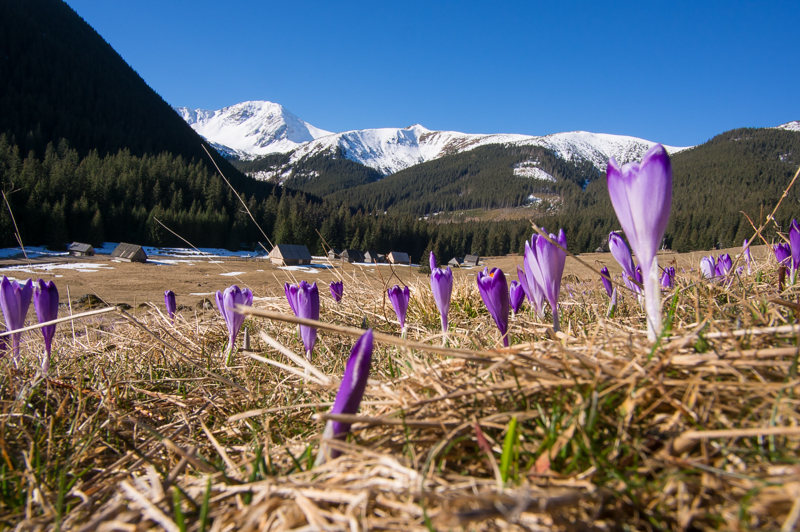 Po prawej spotykamy pierwsze mrożone szafrany spiskie zwane krokusami: