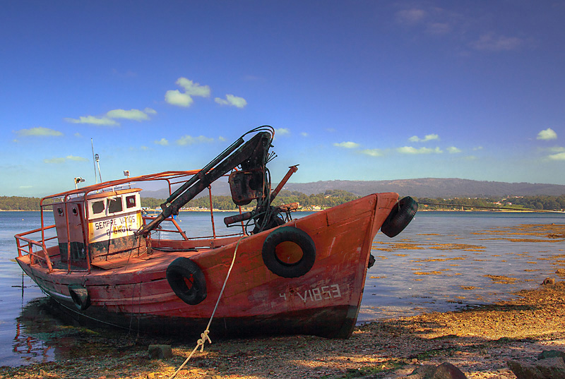 W piasek czerwony od alg Ci wierzę, kolor łódki tłumaczę sobie rdzą ale kolor nieba jest dla mnie nie do przyjęcia. Jeżeli nie chcesz zdjąć czerwonego zafarbu z całości (ze względu na algi- to Ty wiesz jak tam było), spróbuj pobawić się na warstwach i zdjąć ten zafarb z samego nieba.