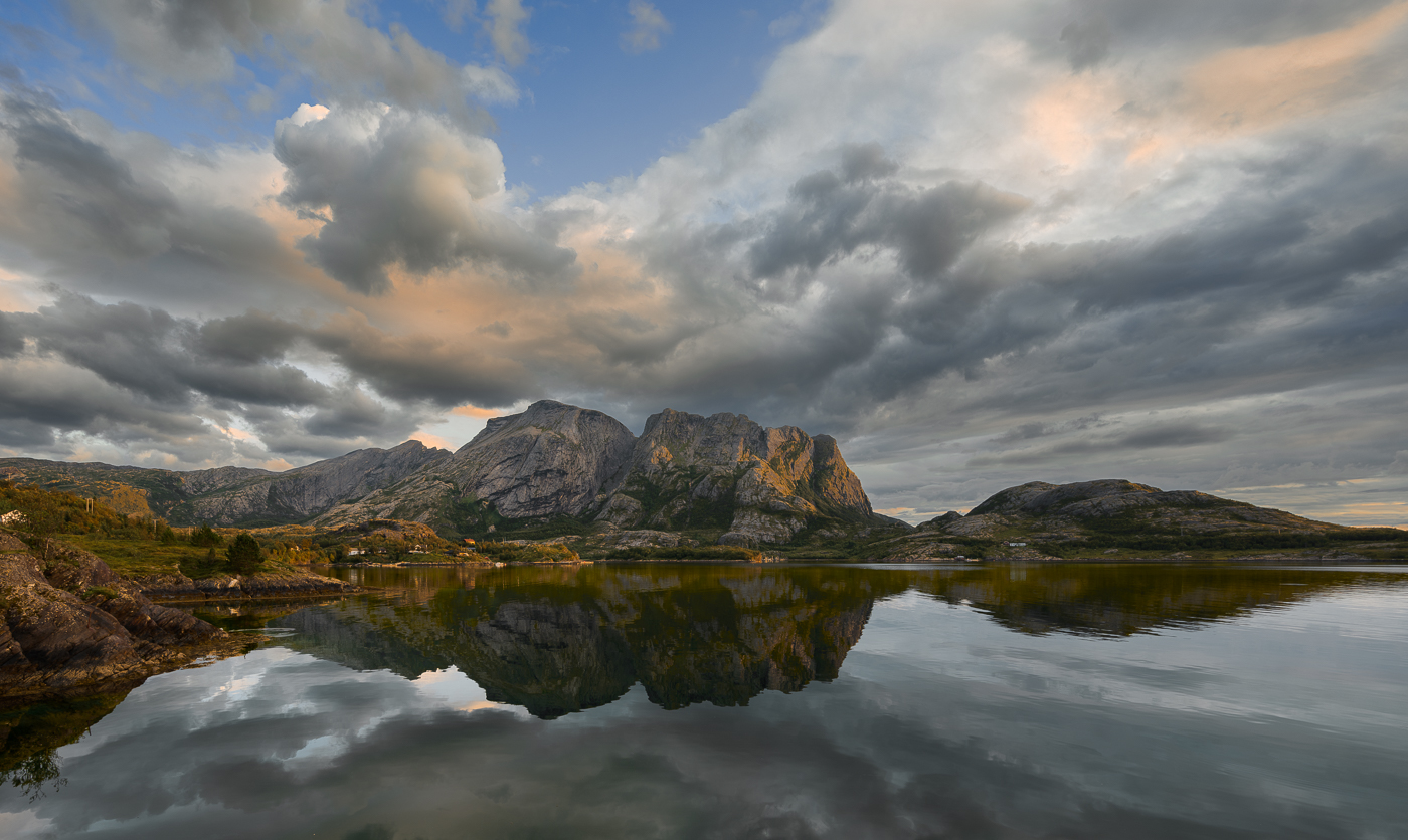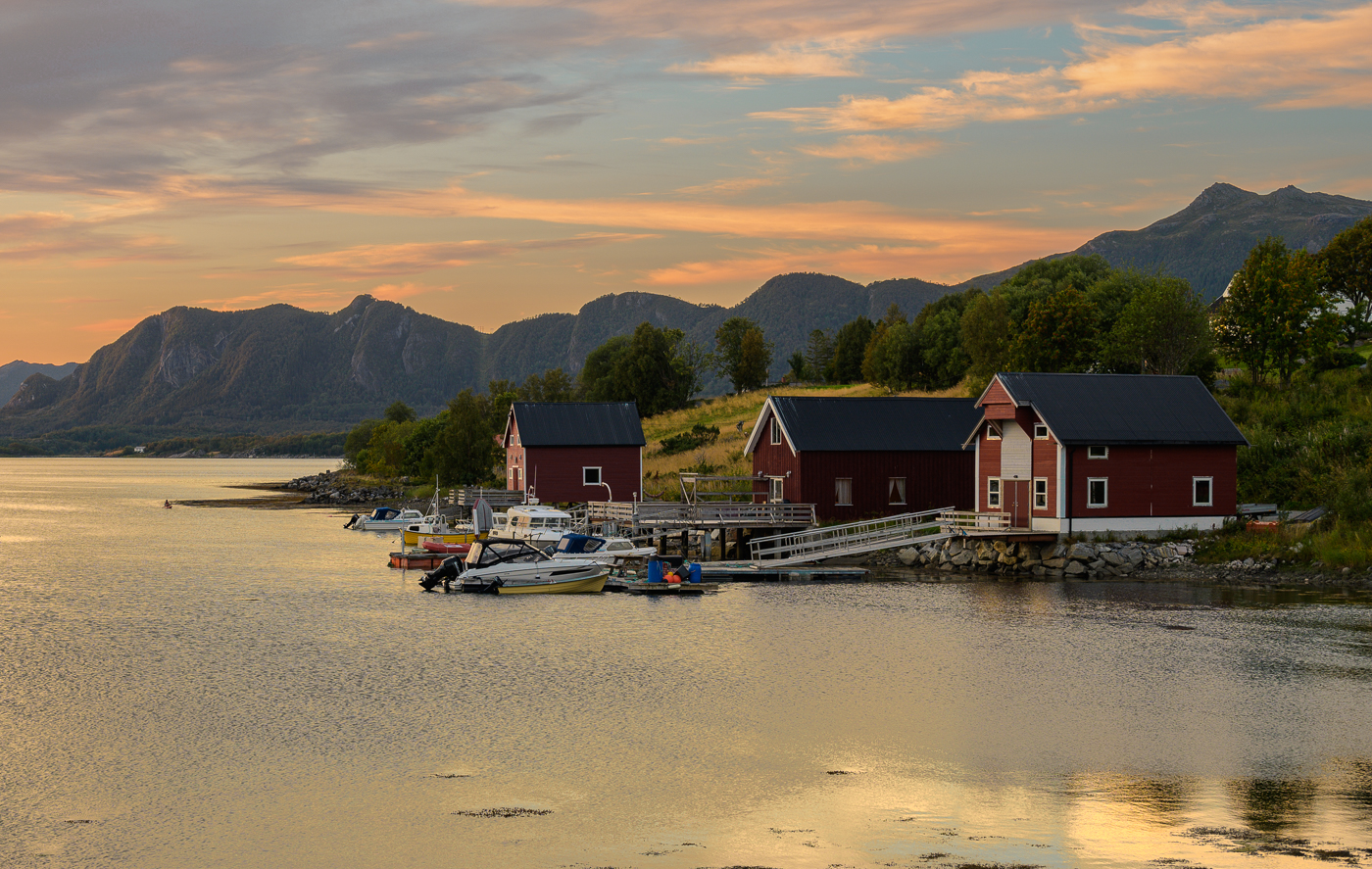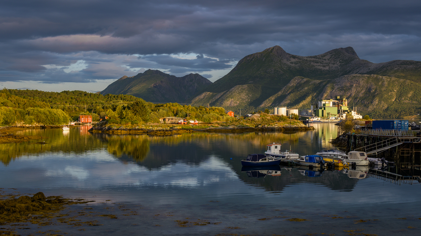 2070 - piękny norweski landszaft. Prawie wieczór, ale światło dogrzewa jeszcze góry, kładzie się na stokach, góry nurzają się w wodzie, nad górami sine chmury, na wodzie łodzie sekundują przyrodzie.