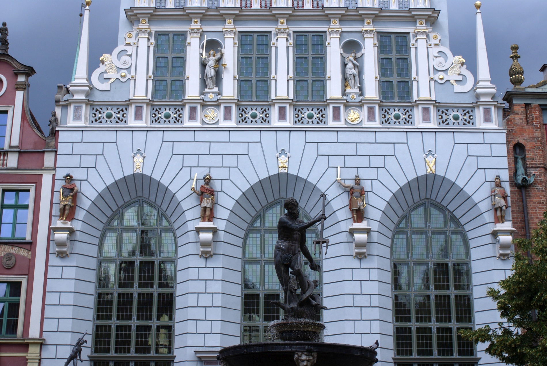 GD23. Standardowa fotka. Neptun na tle Dworu Artusa. W lewym dolnym rogu posąg Hermesa na przedprożu Dworu. Fasada odnowiona niedawno.