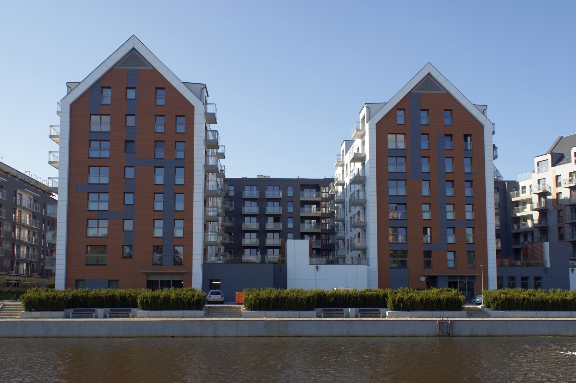 Gd36 Apartamentowce na południowym cyplu Wyspy Spichrzów, widok przez Nową Motławę