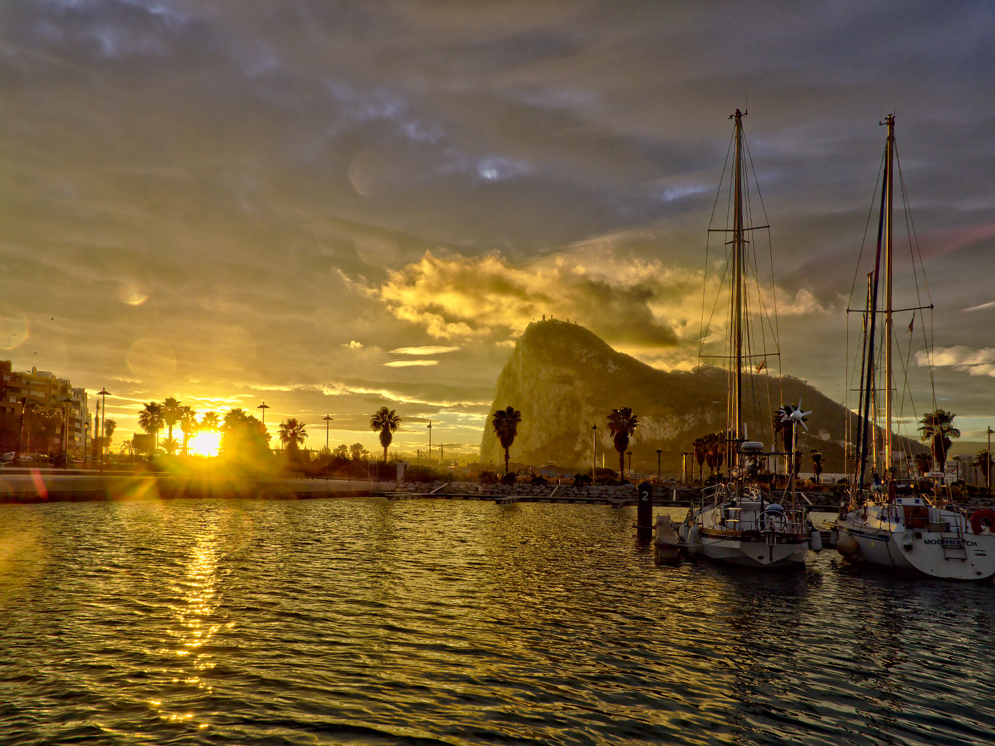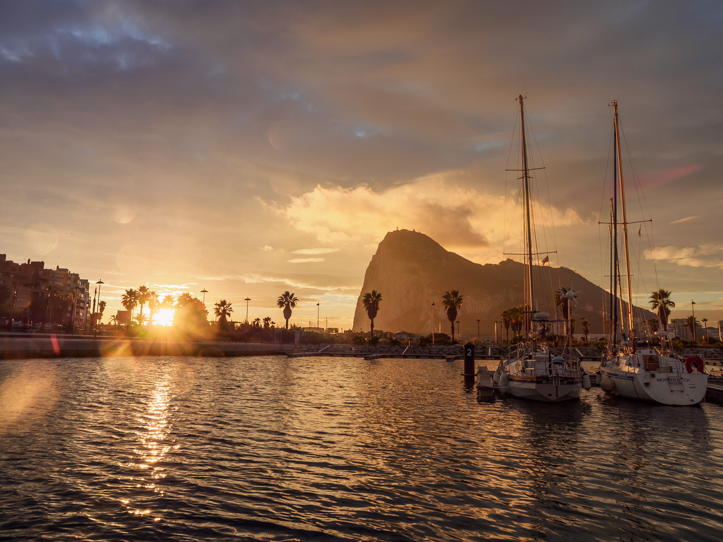 Fotka zrobiona na szybko z zewnętrznego molo w Benalmadenie (najblizszy Malagi port jachtowy) przy wschodzie słońca. Chwile wcześniej fotografowalem Zd 12-60, po zmianie obiektywu niedoświetlilem niestety. Najciekawsze były te ptaki gdzies tam w oddali polujące na sardynki chyba.
