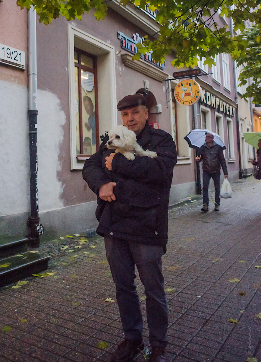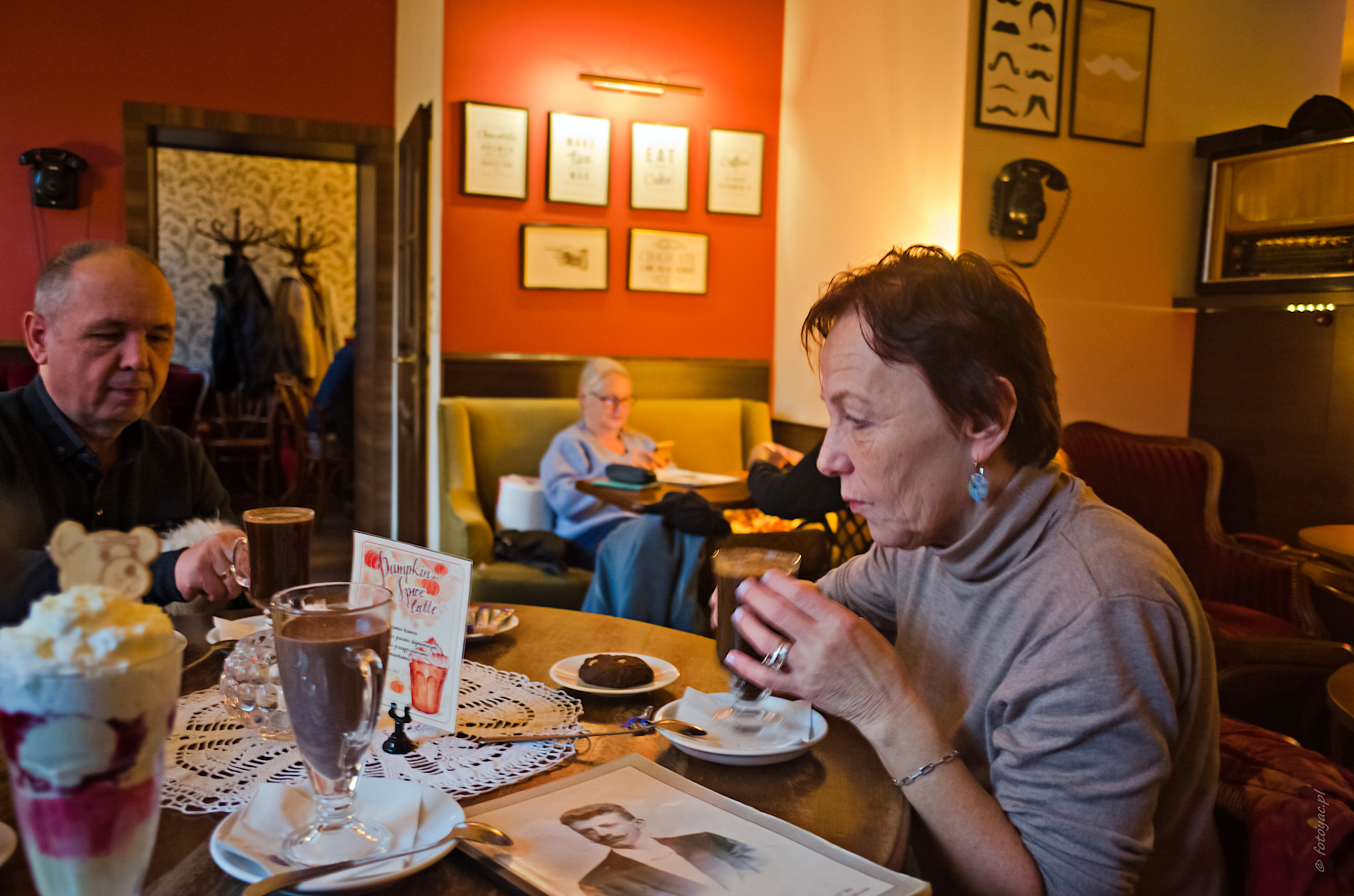 Nieprzyzwoicie lało, więc kawiarnia z duszą na "Starym Mieście". Jagna była przemoczona do skóry, więc siedziała cały czas u mnie na kolanach albo za pazuchą w kurtce. I cały czas się trzęsła bidula. Fotki Jacka i jedna moja z comórki :)