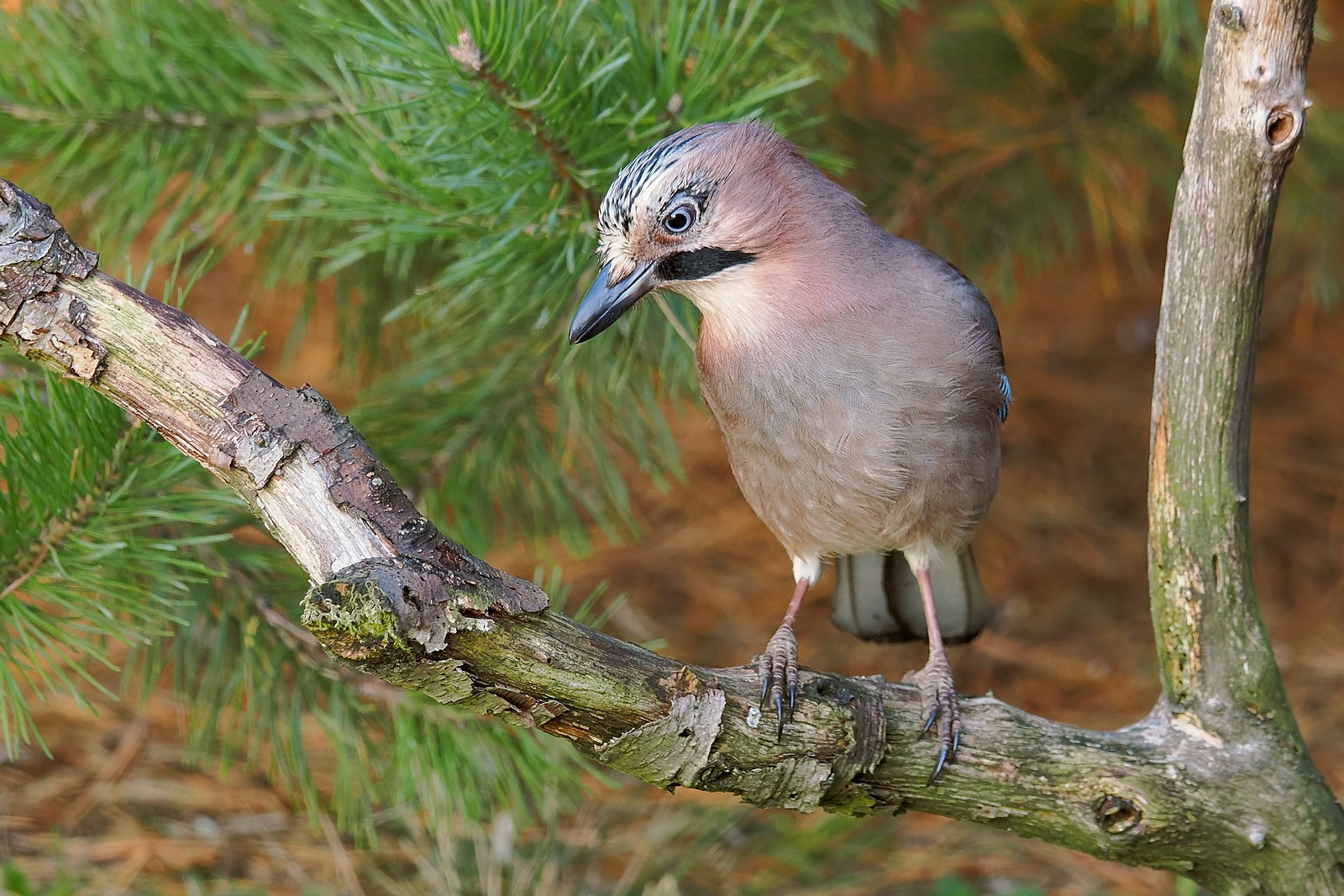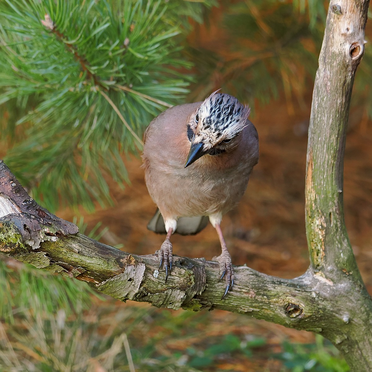 Sójka zaintrygowana czymś poniżej gałęzi: