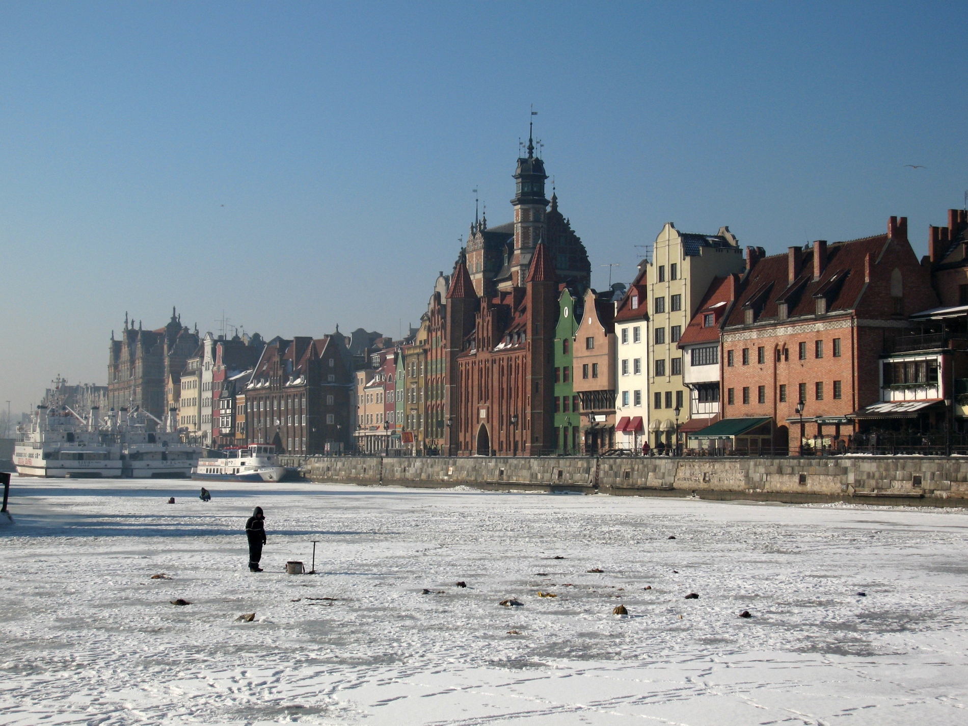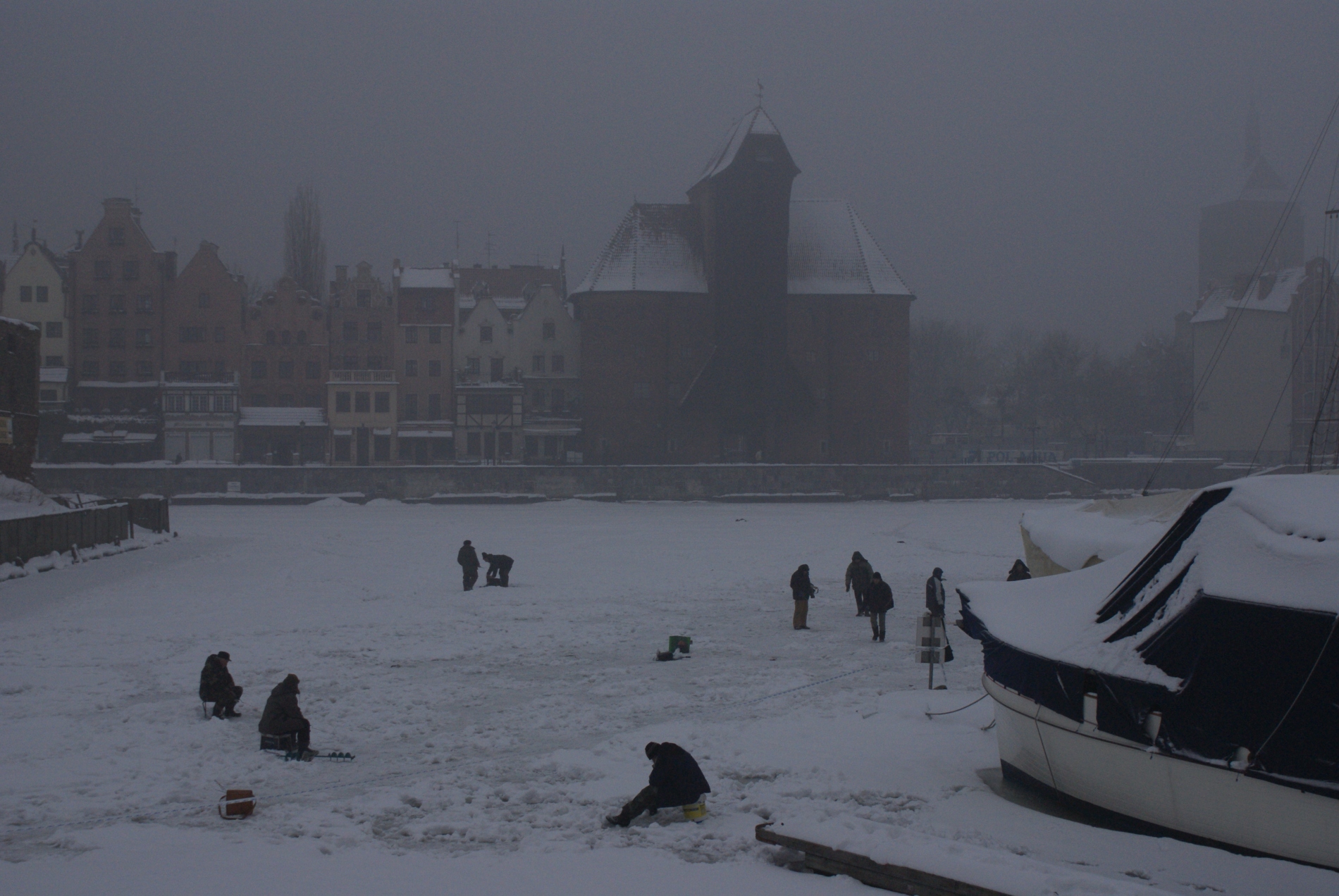 GD196. Wędkarze lodowi na Motławie, luty 2010. W tle po lewej Długie Pobrzeże, w środku Żuraw, po prawej luka w zabudowie ul. Pobrzeże Rybackie. Luka została wypełniona nowymi kamieniczkami około 2012 roku chyba.
