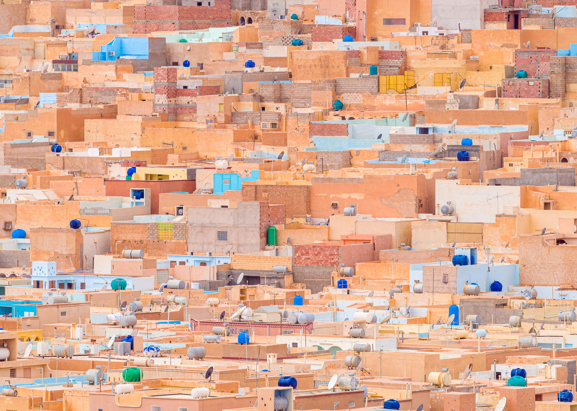 206. Zbliżenie na gęstą zabudowę kasby, w jednym z miast prowincji Ghardaia, położonych w dolinie M’zab w środkowej Algierii.