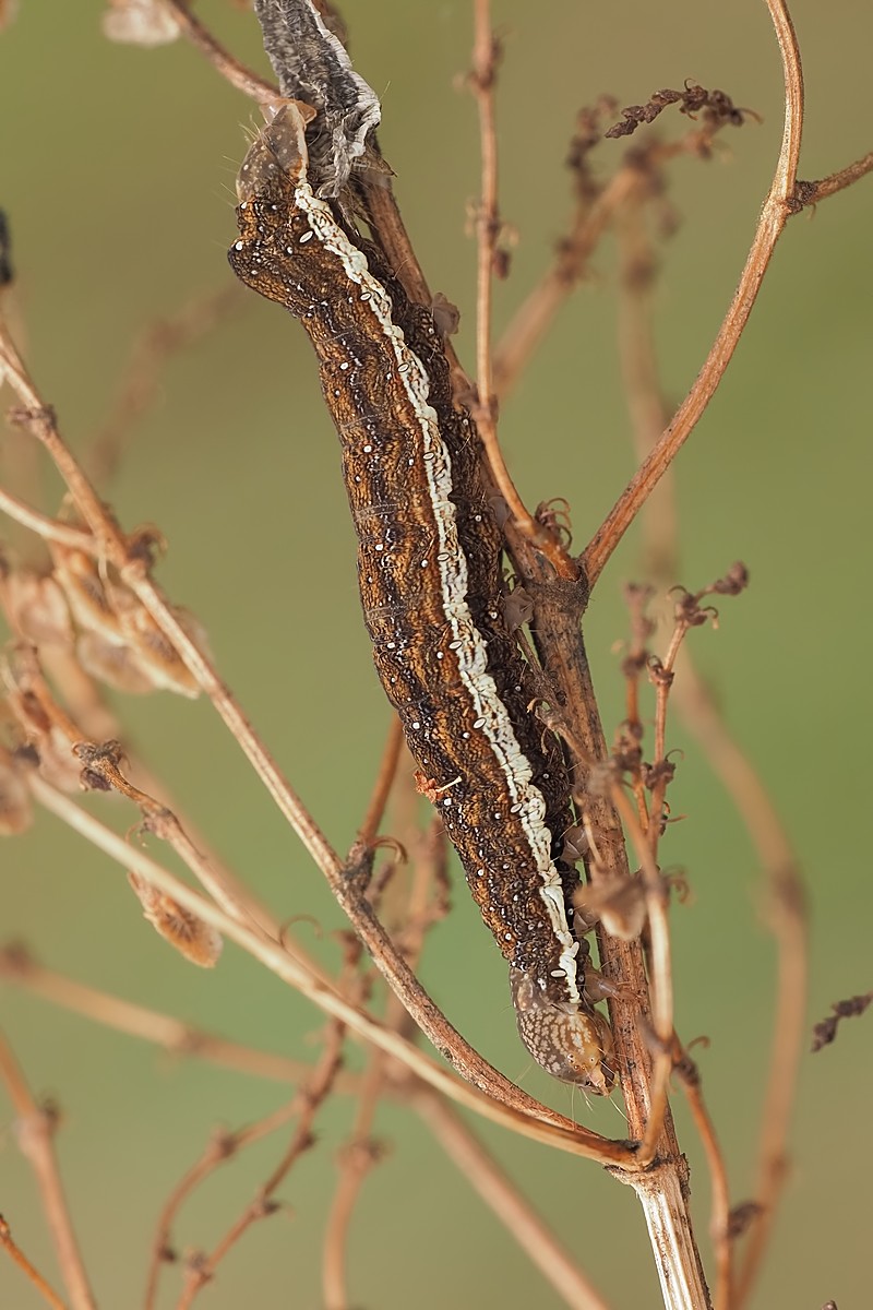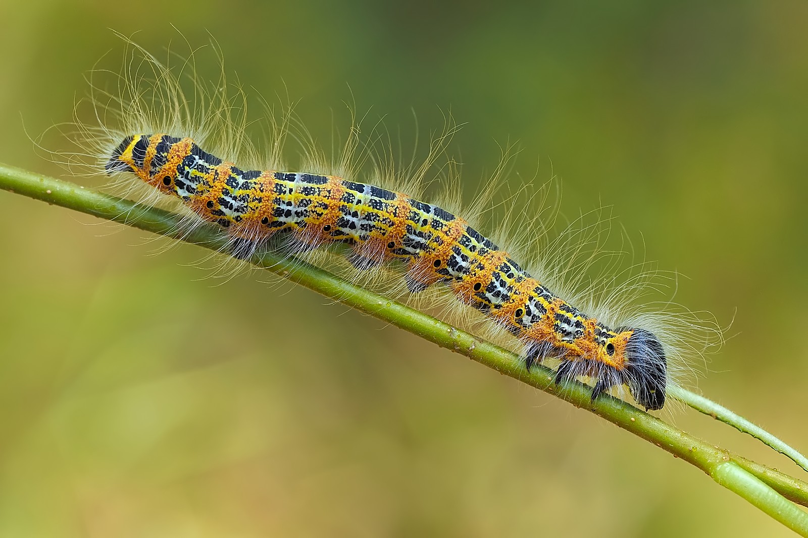 Pozostajemy w temacie gąsienic - gąsienica cmuchy przejrzystej przyłapana tuż po zmianie skórki (na samą zmianę niestety się spóźniłem). Powyżej gąsienicy widoczna pozostawiona wylinka: