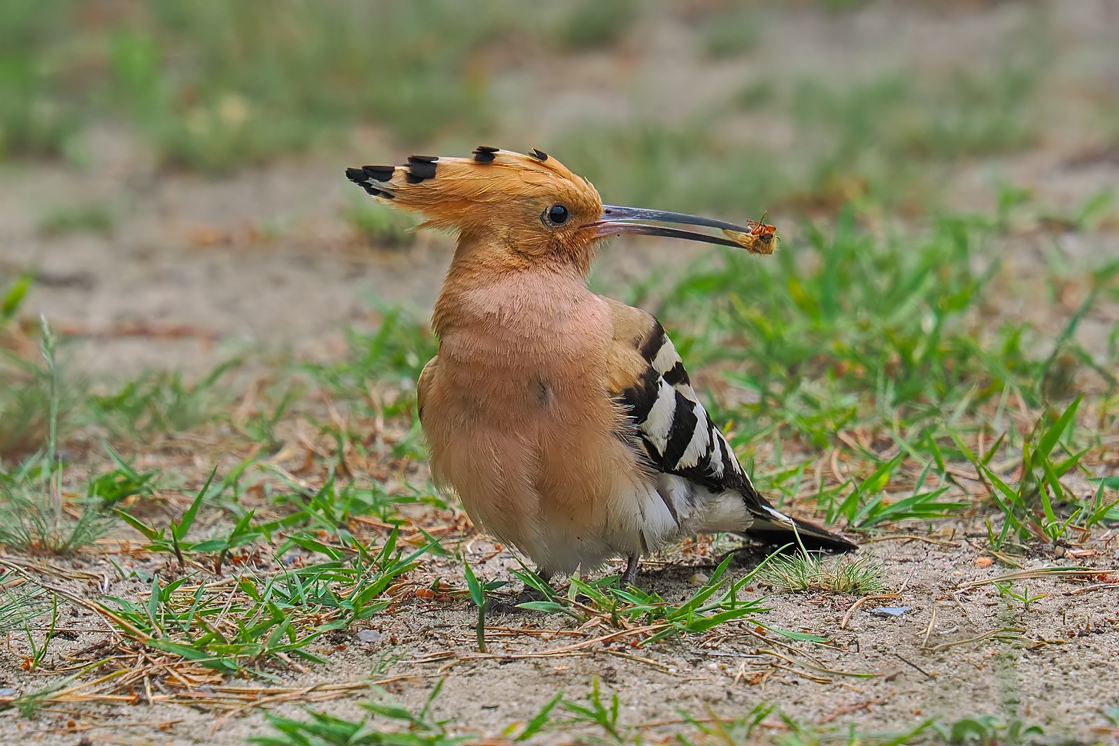 Dudek ze schwytanym chrabąszczem (guniakiem czerwczykiem) w dziobie. Chwile się rozglądał a potem odleciał. Być może zabrał go dla swoich piskląt: