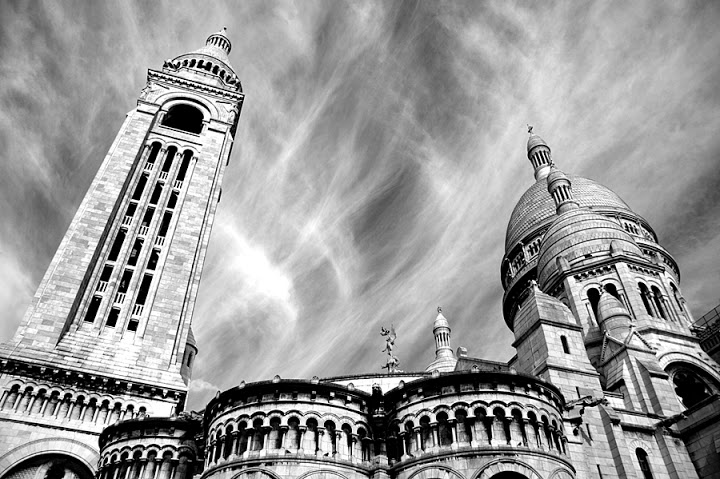 15 -Sacre Coeur, świetne, monumentalne i koronkowe, rozmarzone niebo z łukami białych woali układających sie zgodnie z wieżą strzelistą, rytmy kolumienek na dole dodają wibracji.