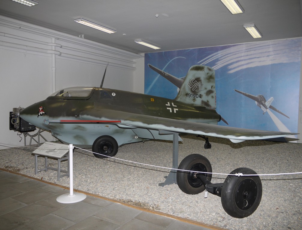 Messerschmitt Me 163 Komet znany też jako Kraftei należy do najbardziej oryginalnych i awangardowych maszyn w lotniczym arsenale II W.Ś. Do dziś jest jedynym w historii załogowym samolotem z rakietowym napędem, który wszedł do produkcji i będącym w operacyjnym użyciu. Płatowiec prócz nietypowego napędu miał układ bezogonowca ze skośnymi skrzydłami i odrzucanym po starcie podwoziem głównym. Lądowanie odbywało się także w specyficzny sposób - dopiero po zużyciu całego paliwa maszyna lotem szybowym mogła przyziemiać. Jako że było tylko jedno podejście, musiało się to udać za pierwszym razem (niestety niekiedy kończyło się katastrofą). Rakietoplan wyposażono w tym celu w wysuwaną płozę i stałe kółko ogonowe. Napęd składał się z silnika pracującego na dwuskładnikowym paliwie ciekłym (wczesna wersja A miała silnik zasilany paliwem jednoskładnikowym). Trzeba tu dodać, iż składniki tej mieszanki były niezwykle niebezpieczne - nie dość że żrące, to jeszcze silnie wybuchowe. Właściwe paliwo stanowiła w odpowiednich proporcjach mieszanina hydrazyny, metanolu i wody tzw. C-Stoff, a utleniaczem był nadtlenek wodoru oznaczany symbolem T-Stoff. Ogólny układ aerodynamiczny Me 163 wywodził się z bezogonowych szybowców projektowanych przez specjalizującego się w tego rodzaju konstrukcjach Niemca Alexandra Lippischa. Pierwszy prototyp oblatano w lutym 1941 (lot beznapędowy), natomiast w sierpniu tego samego roku po raz pierwszy użyto w locie silnika. Komet jest pierwszą w historii pilotowaną maszyną, która przekroczyła prędkość 1000 km/h zbliżając się do bariery dźwięku. Niektóre osiągi jak prędkość wznoszenia i maksymalna deklasowały wszystkie inne ówczesne samoloty. Największymi mankamentami były jednakowoż bardzo szybko zużywające się paliwo, co przekładało się na niewielki zasięg i krótki czas lotu, a także trudny pilotaż potęgowany strachem przed eksplozją, mogącą nastąpić z powodu awarii, lub uszkodzeń w walce. Ogółem zbudowano ponad 350 egzemplarzy wszystkich odmian tej niekonwencjonalnej maszyny. Zdjęcie przedstawia wariant Me 163B z dobrze widocznym eksponowanym osobno podwoziem głównym.