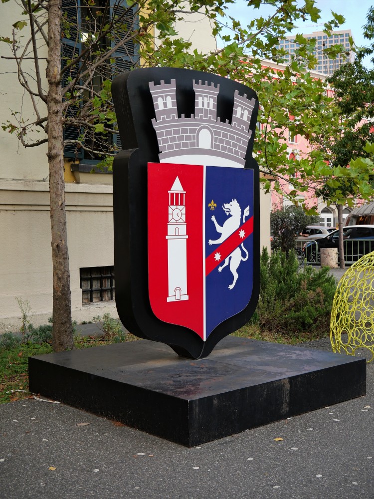 Herb Tirany przy placu Skanderbega w Tiranie.