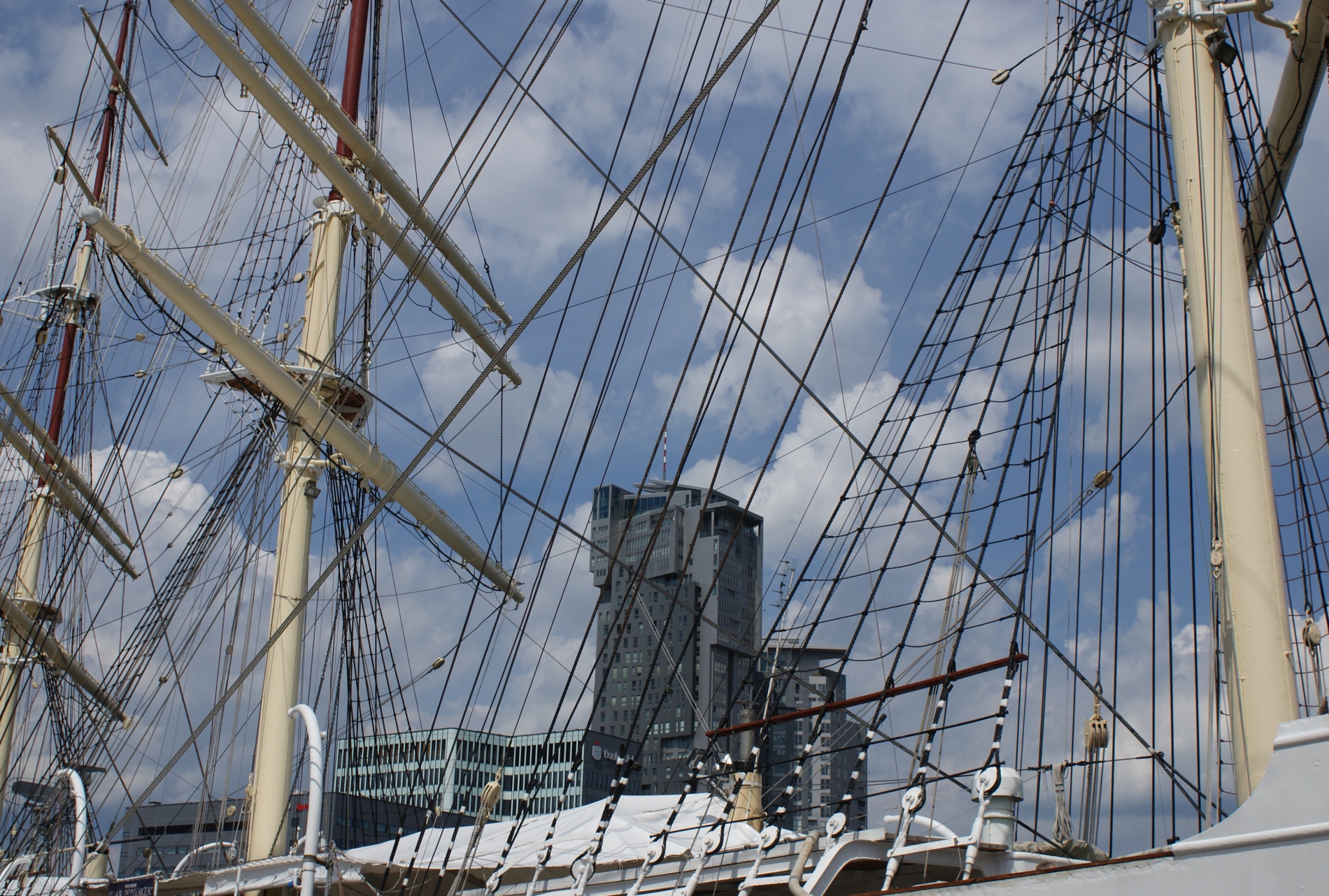 GD393. Gdynia. Widok na Sea Tower przez olinowanie "Daru Pomorza".