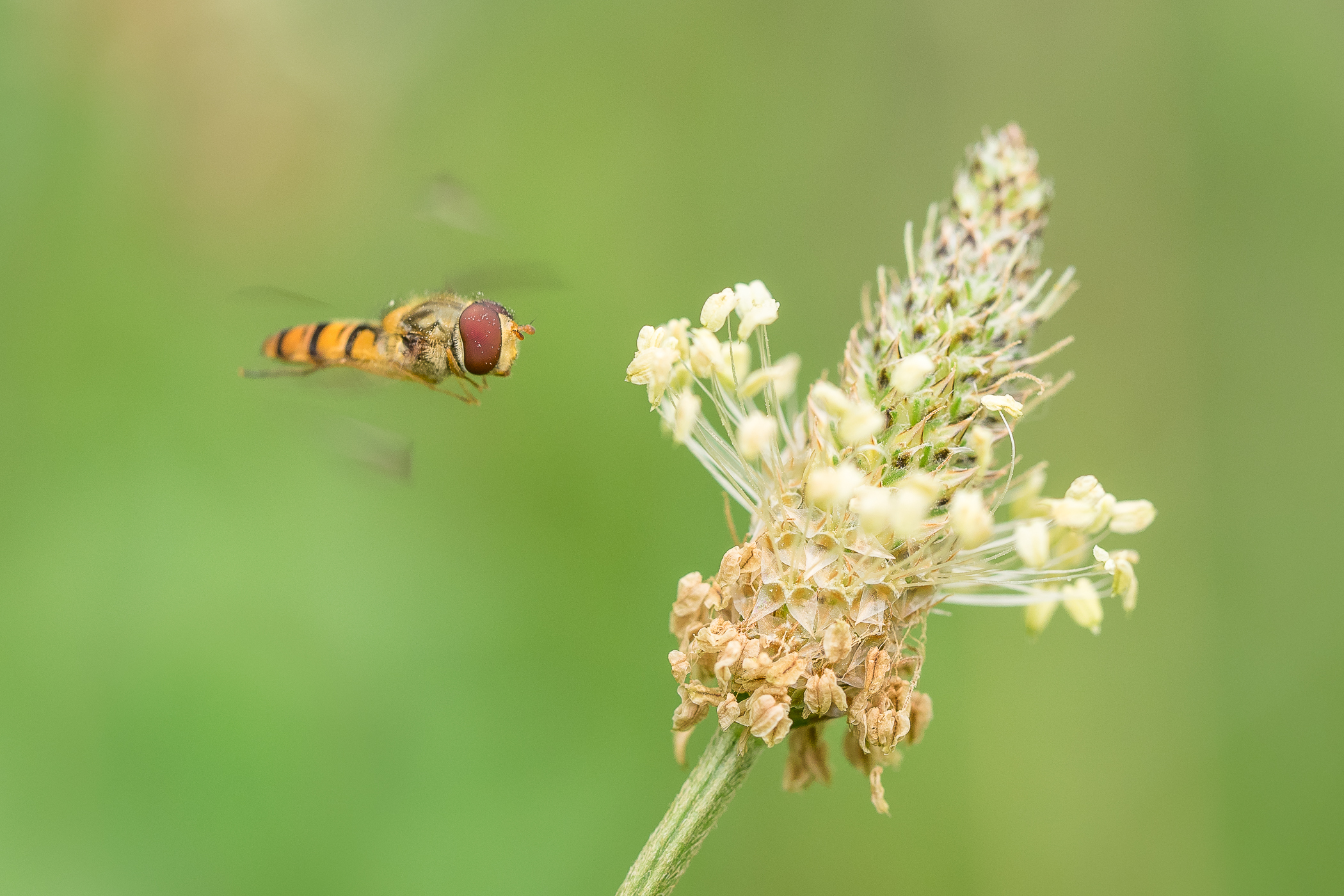 Bzyczek w locie ładnie upolowany. Po zrobieniu takiego zdjęcia kusiłoby mnie by zrobić serię do stacka samego kwiatostanu trawy i potem połączyć stacka trawy z bzygiem.