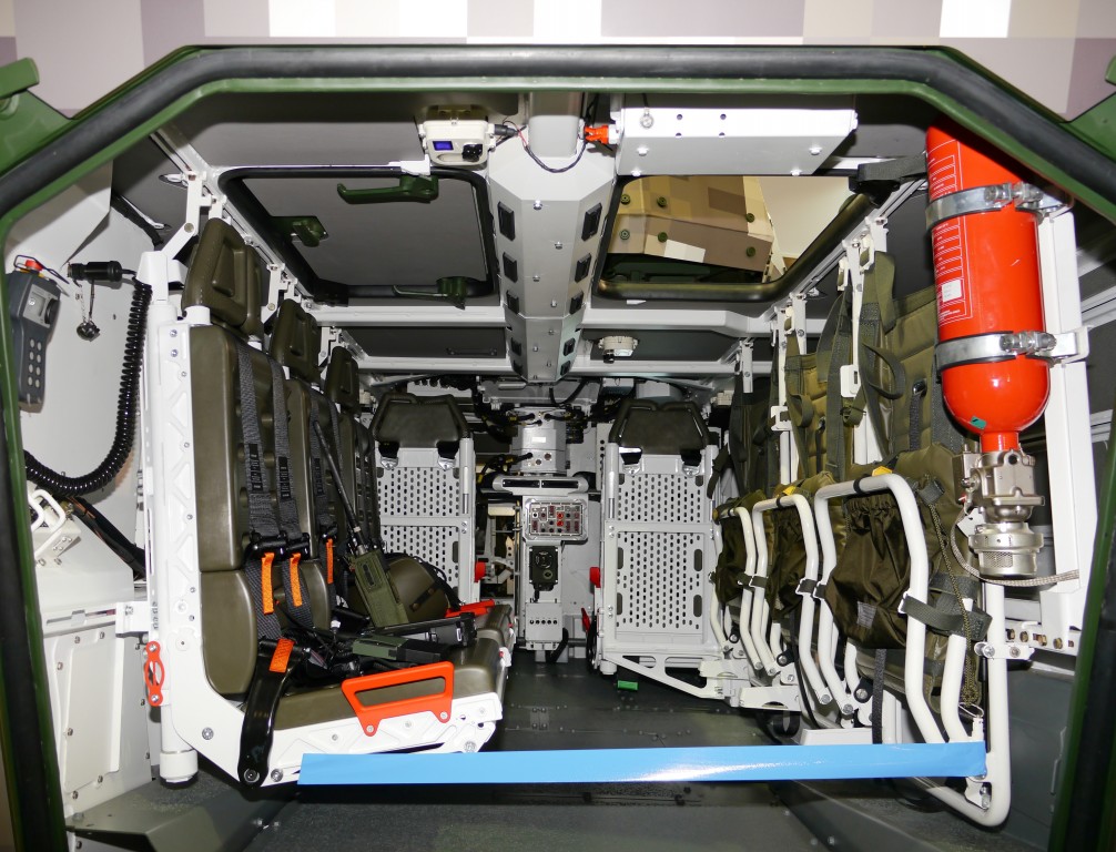 Co do bezpieczeństwa - 100% racji, ale zastanawia mnie, dlaczego te podnóżki są tak głęboko cofnięte pod siedziska. Po dłuższym siedzeniu z tak silnie podkurczonymi nogami nogi drętwieją i po nagłym opuszczeniu pojazdu może to przez kilka minut wpływać na sprawność poruszania się żołnierza - a to też przecież wpływa na bezpieczeństwo. Na zdjęciu nie widać elementów regulacji umożliwiających wysunięcie tych podnóżków do przodu. Chyba że... żołnierze wzajemnie krzyżują nogi i trzymają je na podnóżkach przeciwnego rzędu siedzeń - wtedy pozycja nóg może być całkiem wygodna.
