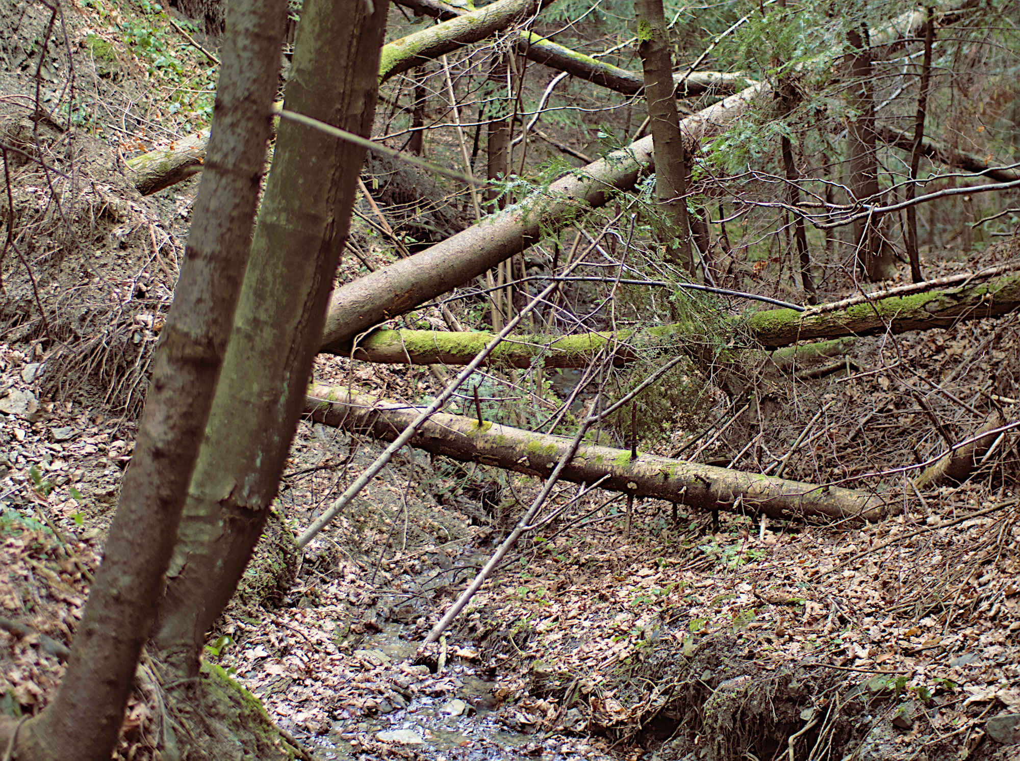 Dużo połamanych drzew po wichurach.