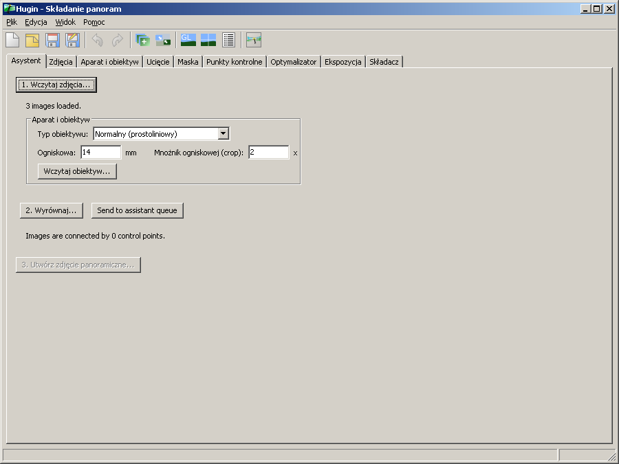 Po wciśnięciu "1. Wczytaj zdjęcia" i wskazaniu potrzebnych zdjęć (kolejność nieistotna) Hugin zazwyczj pyta o parametry (trzeba podać mnożnik ogniskowej). Teraz wciskamy "2. Wyrównaj" i dalej leci samo. Jeśli masz nieaktywne "2. wyrównaj" (albo marudzi) to sprawdź w "Plik->Ustawienia" zakładkę "Wykrywanie punktów kontrolnych": w starszych wersjach Hugina trzeba było zamontować któryś z generatorów, w ostatniej jest już wbudowany "Hugin CPFind" i ten powinien być ustawiony jako domyślny. Jak coś niejasne - pytaj.