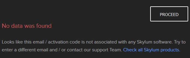 "Wygląda na to, że ten e-mail / kod aktywacyjny nie jest powiązany z żadnym oprogramowaniem Skylum. Spróbuj wprowadzić inny adres e-mail i / lub skontaktuj się z naszym zespołem pomocy technicznej. Sprawdź wszystkie produkty Skylum."
