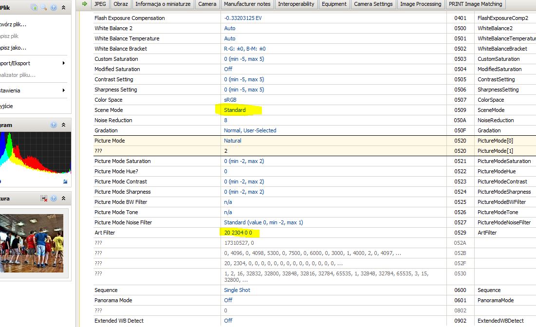 Na drugim zrzucie ma dane odczytane programem PhotoME (odczytuje naprawdę mnóstwo informacji) i pozycja "Scene Mode", o której pisał Bodzip jest wyświetlona jako "Standard", ale już kolejna "Art Filter" pokazuje jakąś wartość. Tu akurat numeryczną, bo widać nie mają w bazie definicji wszystkich wartości, ale w przypadku, gdy żaden filtr nie został użyty, to pojawi się wartość "Off".