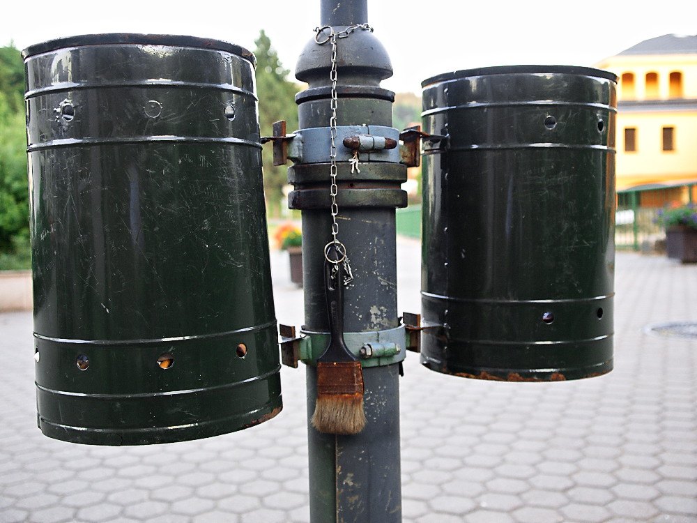 W Teplicach znalazłem też potwierdzenie starego powiedzenia, że potrzeba jest matką wynalazków. Właściciel knajpki zmajstrował poniższy mechanizm na słupie z koszami obok wejścia do ogródka. Przeznaczenie? No jakoś trzeba czyścić popielniczki z petów, które zostawiają goście :)
