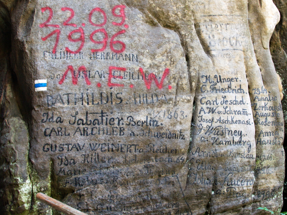 Tereny te są bardzo chętnie odwiedzane przez turystów i widać to na każdym kroku. Gdyby chcieć zwyczajowo witać każdą napotkaną na szlaku osobę, praktycznie co chwila trzeba by mówić "dzień dobry". W wielu miejscach na skałach można zauważyć napisy. Gdy zobaczyliśmy pierwsze z nich, trochę się zdziwiliśmy, ale kolejne dały nam do myślenia, że coś w tym musi być. Okazuje się, że był to bardzo popularny w XIX w. wśród turystów sposób upamiętniania swojej wizyty w Skalnym Mieście. Zostawiali po sobie pamiątkę w postaci podpisu na skale lub nawet w formie tablicy pamiątkowej.