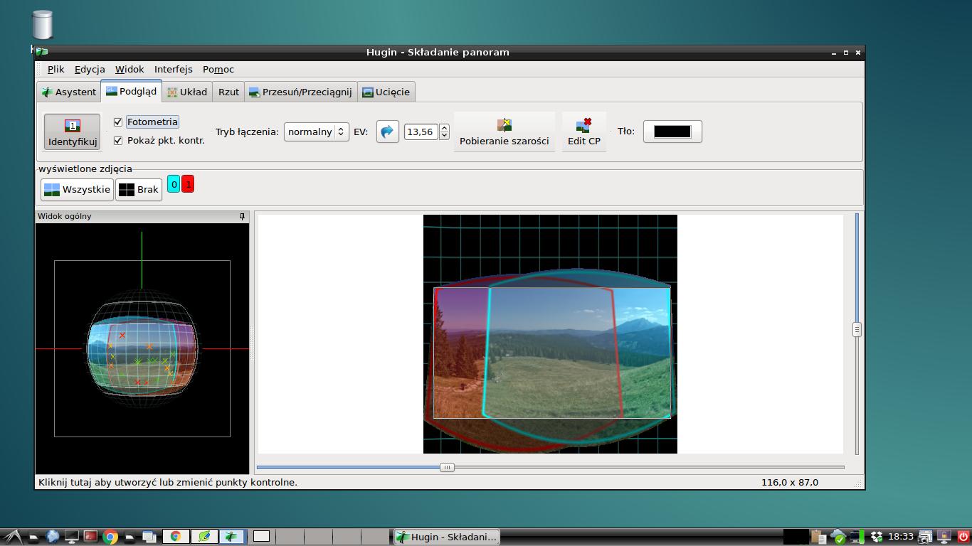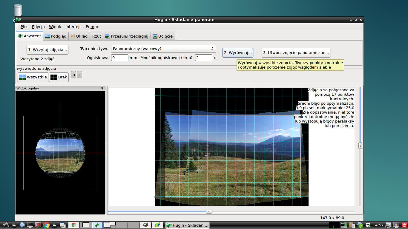 Po prawej stronie mamy informację jak wyszło dopasowanie zdjęć, i ilu punktów kontrolnych użył program. Jako ciekawostkę podam, że jeśli Hugin napisze nam, że mamy złe dopasowanie, to proszę się nie przejmować i spróbować złożyć panoramę. W 99 % przypadków panorama będzie dobrze złożona. Ewentualnie przekręcona lub z inną deformacją - ale to w kolejnych lekcjach.