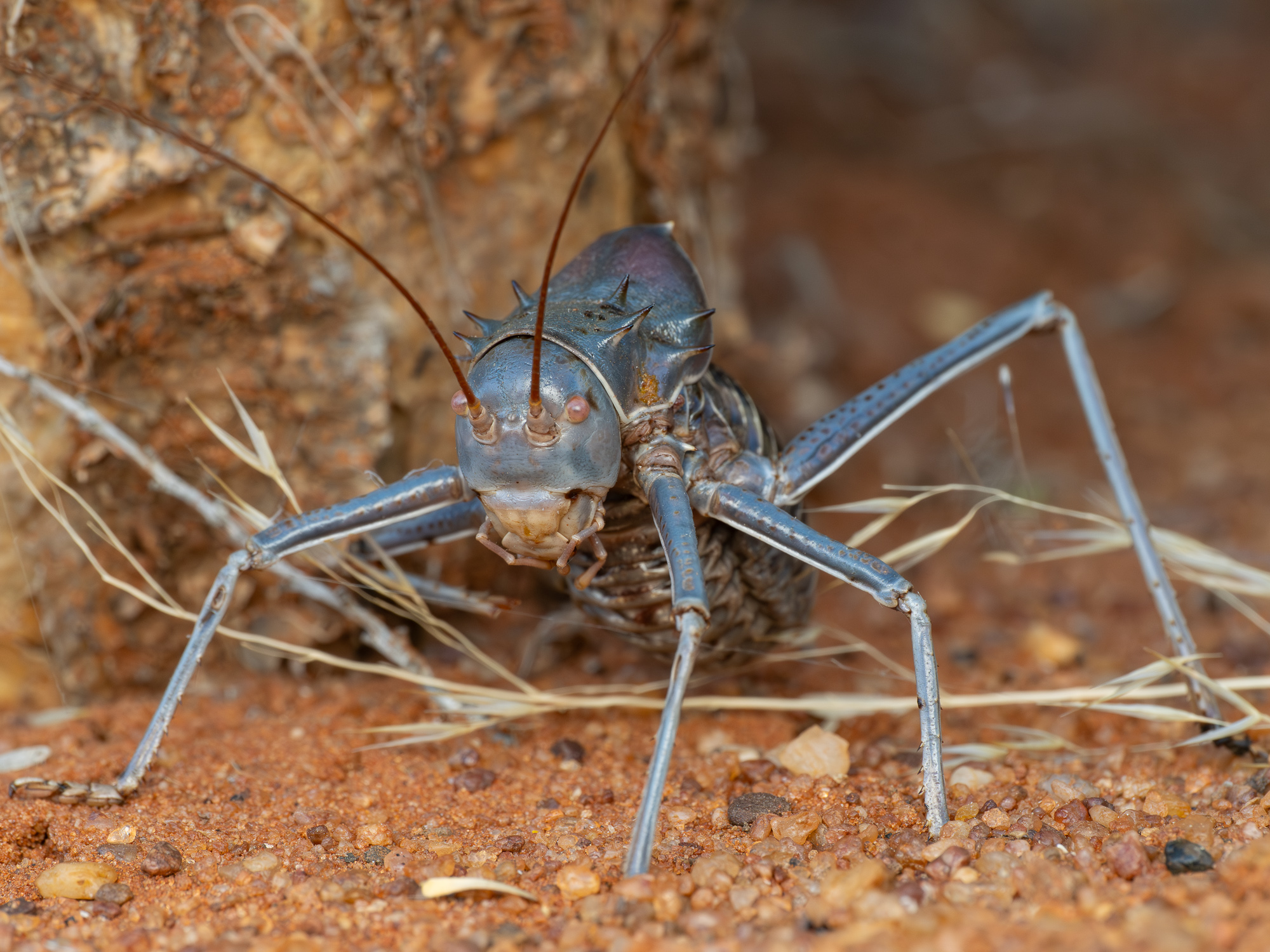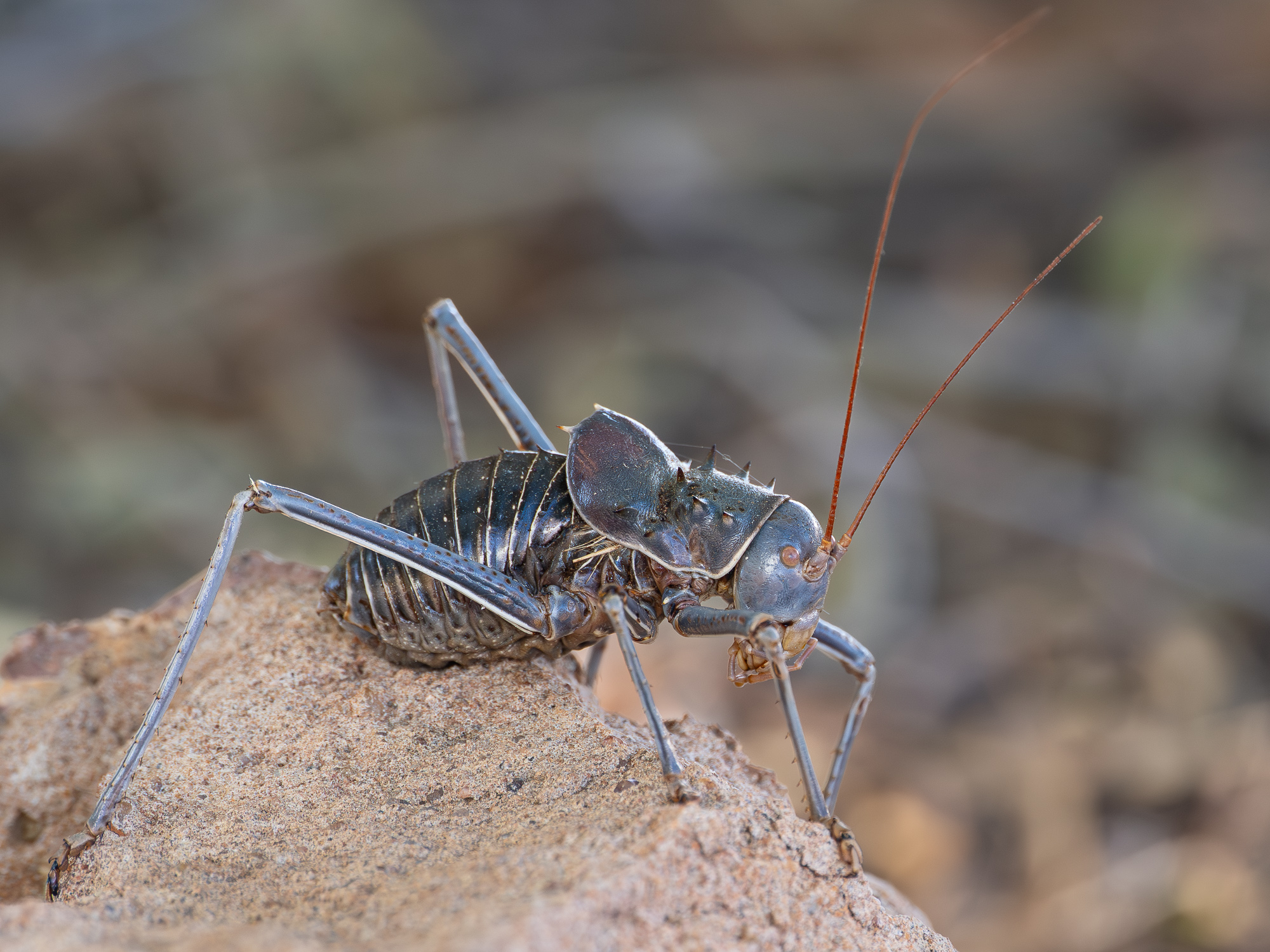 2 lata temu byłem nieco zawiedziony nieobecnością Acanthoplus discoidalis z rodziny pasikonikowatych. Jak teraz się dowiedziałem, te duże, ok. 5 centymetrowe owady występują sezonowo i nie każdego roku można je spotkać. Tym razem było ich mnóstwo i trzeba było uważać, żeby ich nie podeptać, bo często kręciły się w okolicach schodów na taras. Lepiej się z nimi ostrożnie obchodzić, bo - jak to pasikoniki - potrafią solidnie ugryźć swoimi imponującymi szczękami. A do tego potrafią prysnąć hemolimfą (taką owadzią krwią) na odległość kilku cm. Robią to jednak tylko w sytuacji zagrożenia. Kilkukrotnie przenosiłem je w bezpieczne miejsca w obawie przed zadeptaniem i nie wykazywały agresji :)