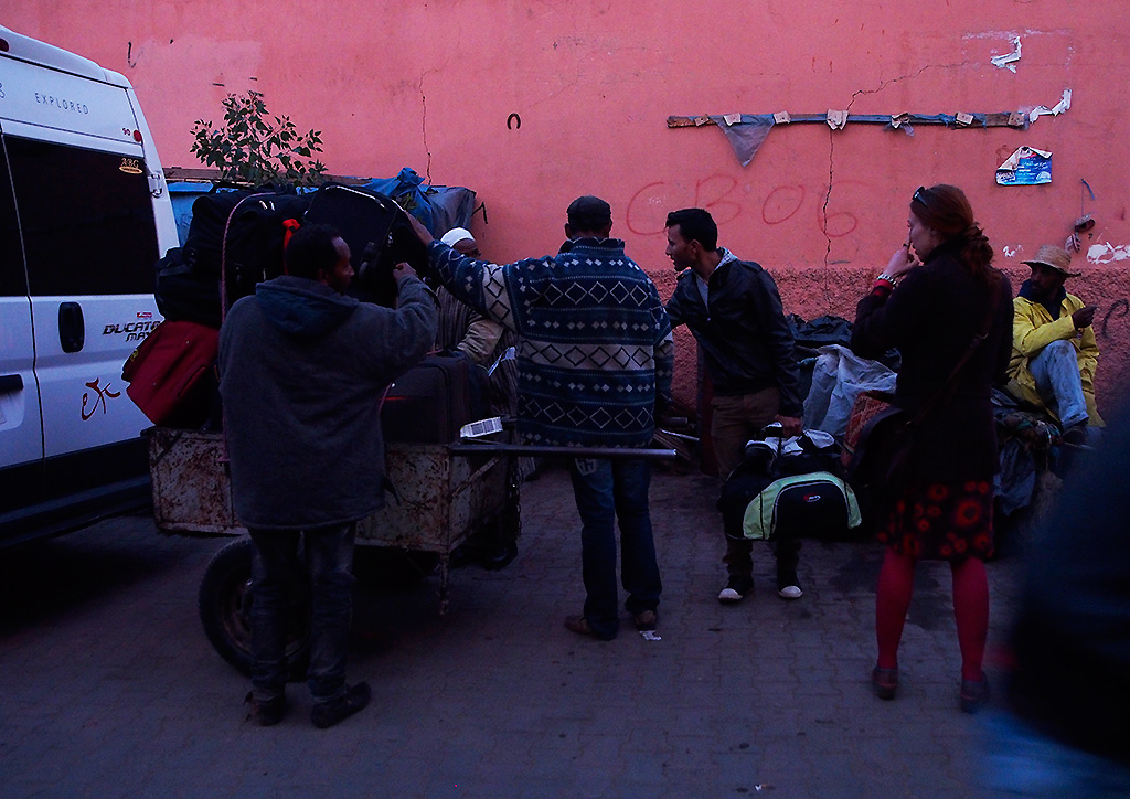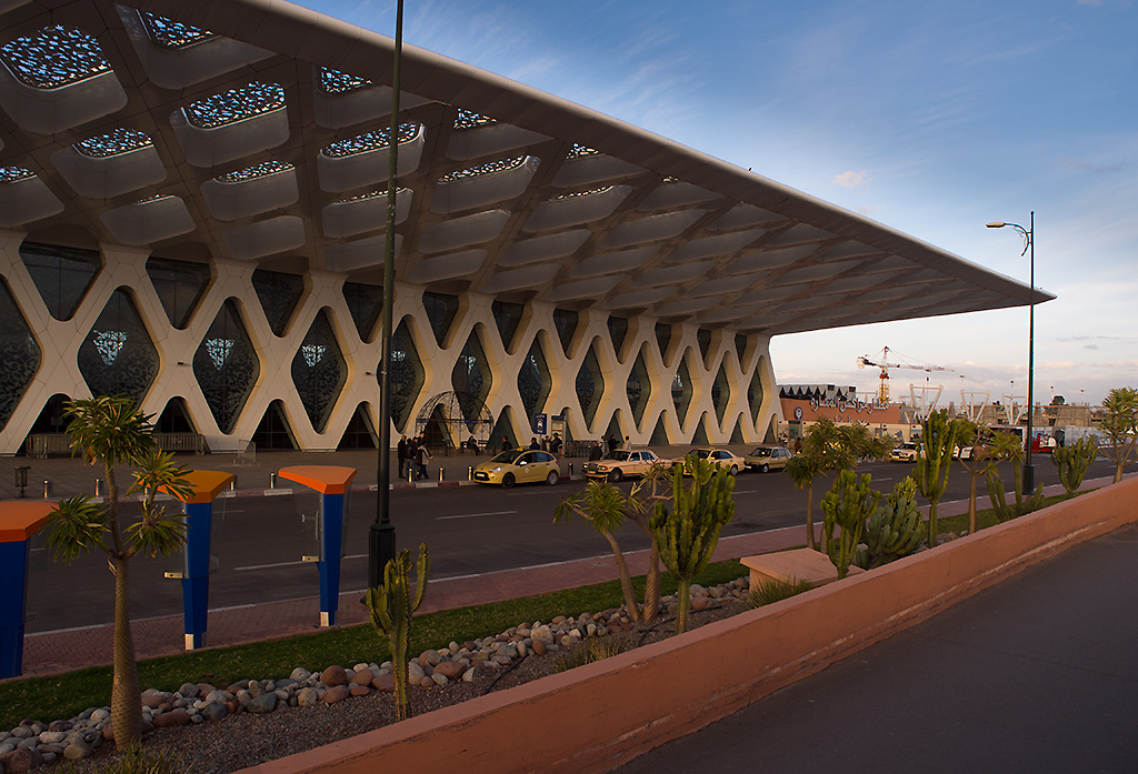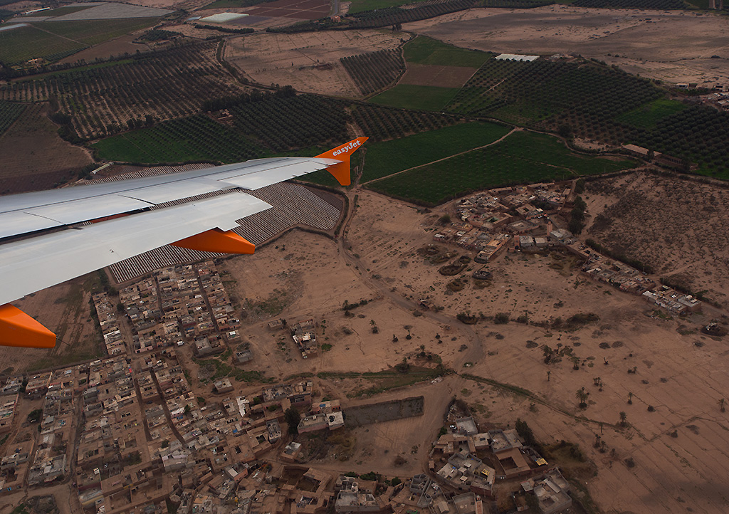 Miało być po kolei - większość uczestników tej wyprawy była z południa Polski, ale z braku rozsądnych i ekonomicznych połączeń lotniczych z Polski wylatywaliśmy z Berlina. O ile dojazd do lotniska był długi i zimowy cały lot nad gęstymi chmurami, Marakesh powitał nas zachodem słońca. I tutaj było pierwsze moje zaskoczenie na tej wyprawie - podczas podchodzenia do lądowania, zobaczyłem z góry dziwne płoty na polach z budulca o barwie ogrodzonych działek i brązowo-czerwoną ziemię, z niewielka ilością zieleni. A potem brunatne miasto o architekturze odmiennej od tej do któtej jestem przyzwyczajony na codzień.
