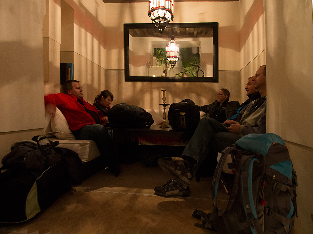 Domu mieszkalne w Medynie są przebudowywane na hotele dla turystów. Maja one ściany z niewielkimi okienkami zewnętrznymi, natomiast w środku znajduje się dziedziniec w tych adaptowanych do celów hotelowych domach zamknięty foliowym dachem, w naszym przypadku zbiera się z niego wodę do podlewania zieleni. Wszystkie pokoje maja drzwi wyjściowe i okna otwierane na tenże dziedziniec i przez tenże dziedziniec są wentylowane. Nasze pokoje posiadały łazienki. Mieliśmy do dyspozycji cały budynek. Z jego przestrzenią wypoczynkową, pokojem z kominkiem i stołami do śniadania i dachem z zadaszoną mata bambusową przestrzenią wypoczynkową oraz niewielkim basenem, z którego z powodu temperatury nie dało się skorzystać. Ale o tym później.