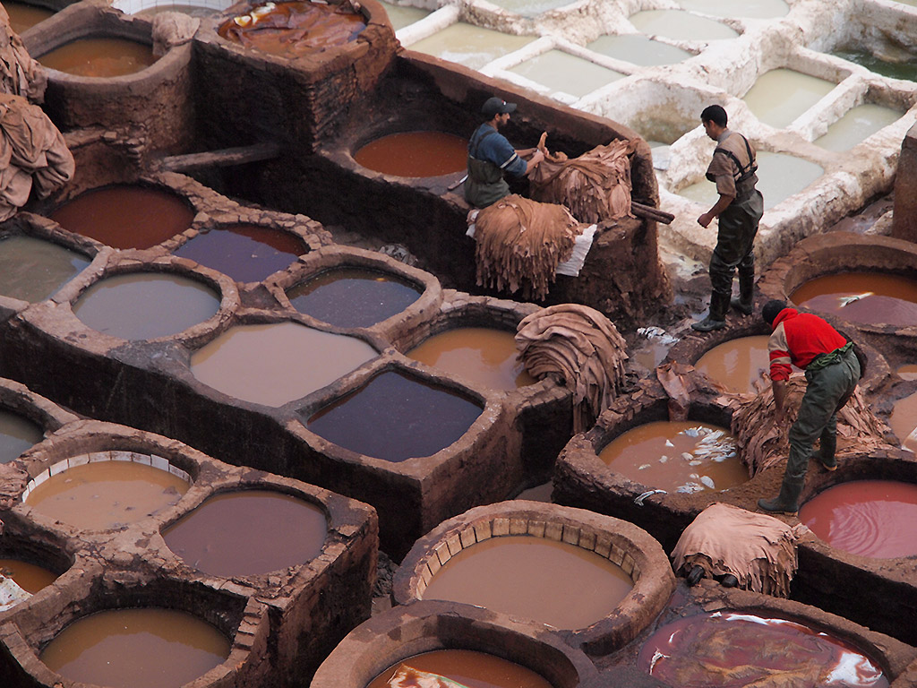 Wrażenia zapachowe jak z garbarni, cała ta część Fez-u śmierdzi specyficznie. Podobno to głownie efekt zapachu roztworów mocznika używanych do pozbawienia skór włosa na wstępnym etapie obróbki. Ale ja nie bardzo w to wierzę, zwiedzającym podaje się gałązkę świeżej mięty przy wejściu.