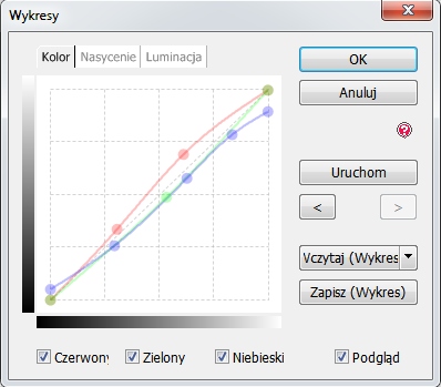 Masz trzy (RGB) czerwony, zielony, niebieski. Na dole zaznaczasz którą chcesz operować. Dolny zakres krzywej to cienie, środkowy tony średnie, górny zakres to światła. Klikając na krzywej stawiasz punkt np. na środku i przeciągając krzywą (do góry) w dolnej części uwydatniasz dany kolor w dół osłabiasz. Podobnie z rozjaśnieniem (zakładka u góry luminancja) możesz rozjaśnić tylko cienie lub przyciemnić światła.