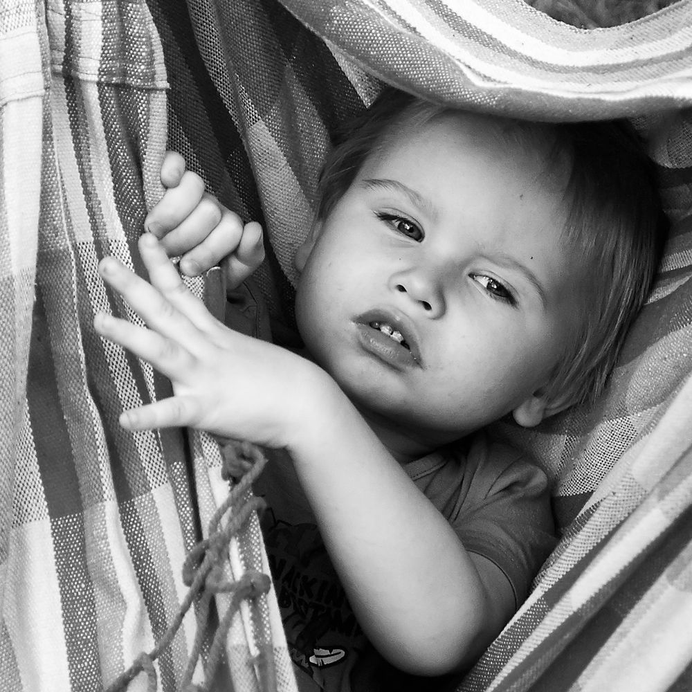 1. Filip, lat 2.5 (mój młodszy syn) - zazwyczaj wszędzie biega bez opamiętania, niczym kurczak bez głowy. Na tym ujęciu trochę zaplątany w hamaku, uchwycony w - dosyć rzadkim u niego - nieco poważniejszym nastroju, czymś na kształt lekkiej zadumy.