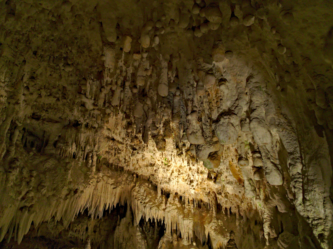 Ciekawostka. Te bulwy rosnące ze stropu to nie stalagmity. Zbudowane z identycznego materiału jak wszystkie nacieki, ale rosną bardzo szybko - ok. 7-10 mm/rok. A wewnątrz tych bulw jest woda.