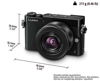 - Masa Około 211 g / 0,46 lb (karta SD, bateria, korpus)/Około 180 g / 0,40 lb (tylko korpus)/Około 281 g / 0,62 lb (karta SD, bateria, obiektyw H-FS12032)/Około 326 g / 0,72 lb (karta SD, bateria, obiektyw H-X015)/Około 346 g / 0,76 lb (karta SD, bateria, obiektyw H-FS35100)