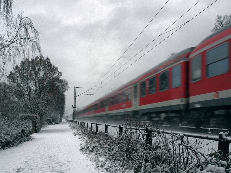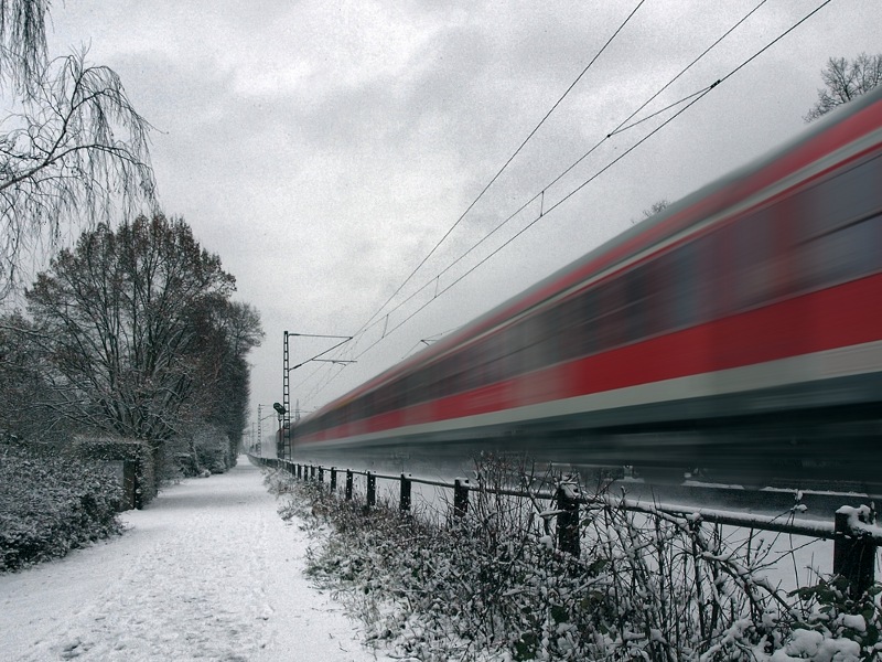 Natomiast rozmycie pociągu to jest to co mnie przekonuje. Pociąg nadjeżdżał, zobaczyłem śnieżny tuman i podjąłem decyzję. Ustawiłem światło, złapałem ostrość a na zmianę ISO (1600!) już nie starczyło czasu- pociąg i tak już uciekał z kadru. Ale jeszcze powtórzę zdjęcie, kiedy spadnie trochę świeżego śniegu