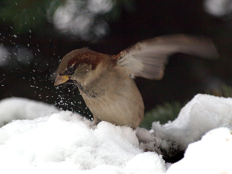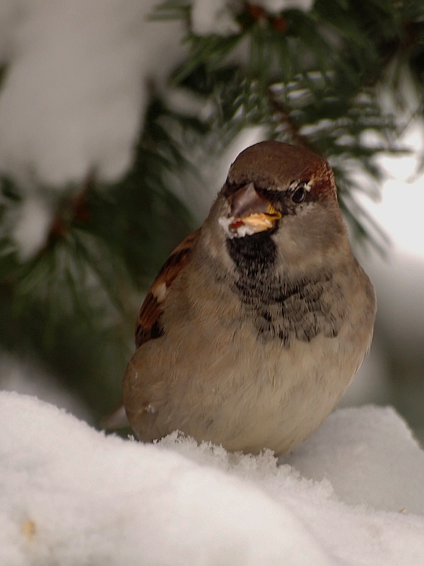 W lato, udało się "zachęcić" jedynie kosy. Tym razem są wróble i skorki. Udało mi się zawiesić kulę tłuszczu z ziarnem ale na razie sikorki jedynie tę kulę wyjadają a na gałęziach obok nie chcą posiedzieć. Nie to co wróble- te przylatują stadami i wyjadają również pokarm, który sypię z okna na gałęzie. Póki co, nie ma dobrego światła ale na razie ptaszki się przyzwyczajają. Może jak będzie więcej światła, będą już zadomowione![]()