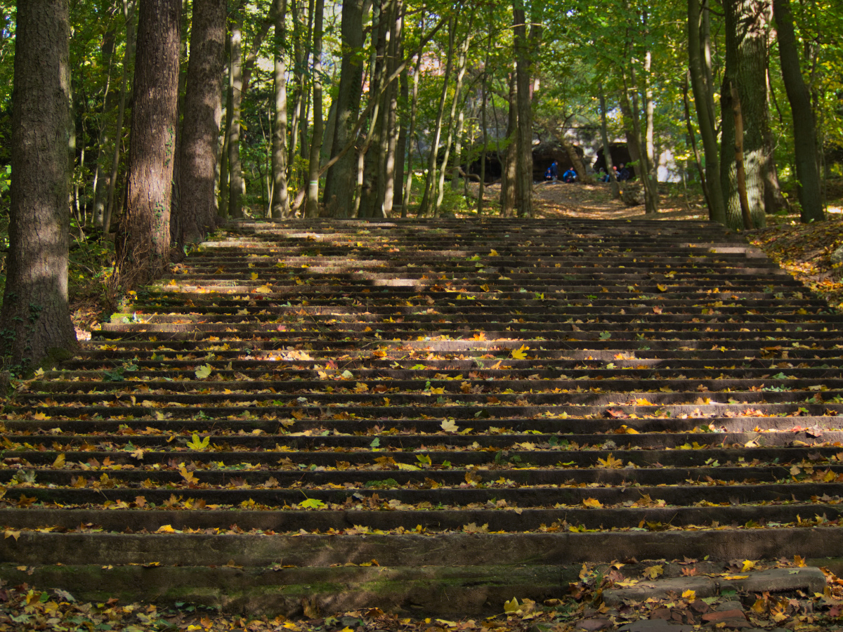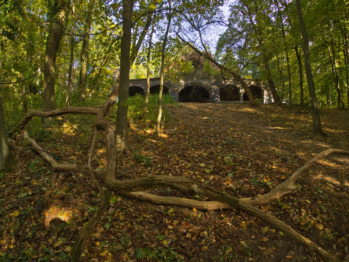 To co powyżej, to tylko niewyraźny zarys czegoś między drzewami. Kiedyś, na końcu schodów, droga rozchodziła się w obie strony i łukami dochodziła do podnóża wieży. Dziś wszystko zarośnięte, więc naprzód. Kilkanaście kroków dalej (wyżej) i zaczyna się wyłaniać cel wycieczki.