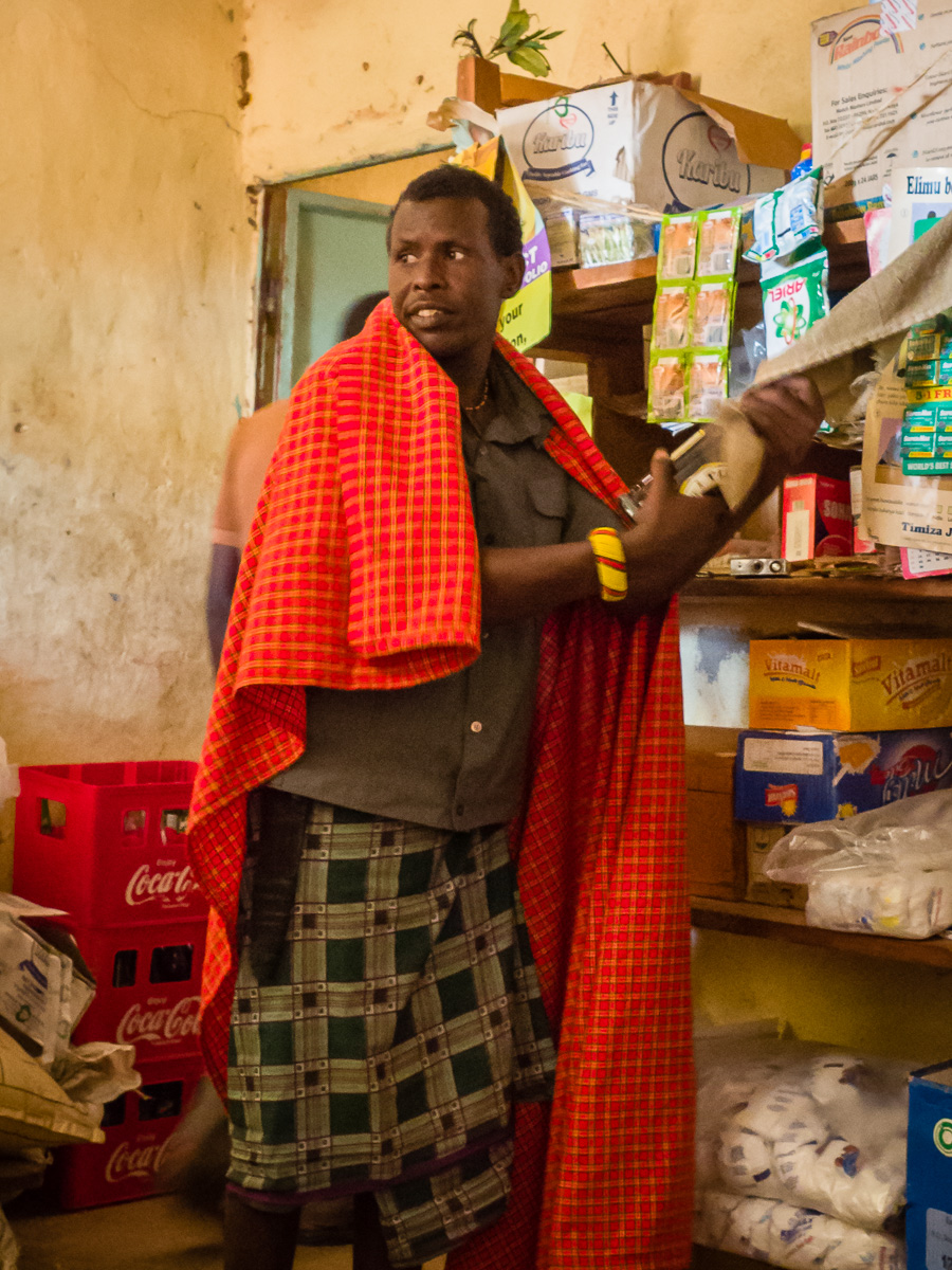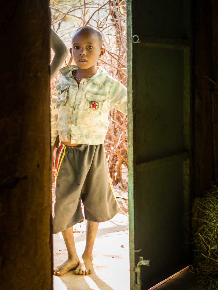 189. Nasz przyjazd do baro-sklepu wzbudził lokalną sensację i z całej wioski zaczęli ściągać zaciekawieni mieszkańcy, głównie dzieci. Tutaj przez drzwi nieśmiało spogląda na "mzungu" młody chłopak.