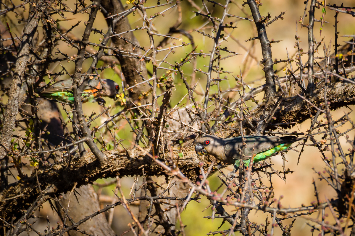 246. Dwie afrykanki krasnopierśne z trudem wypatrzone w kolczastym krzewie.