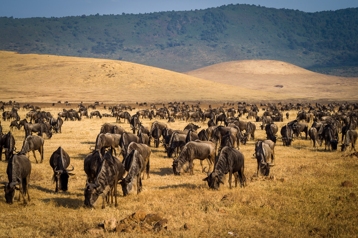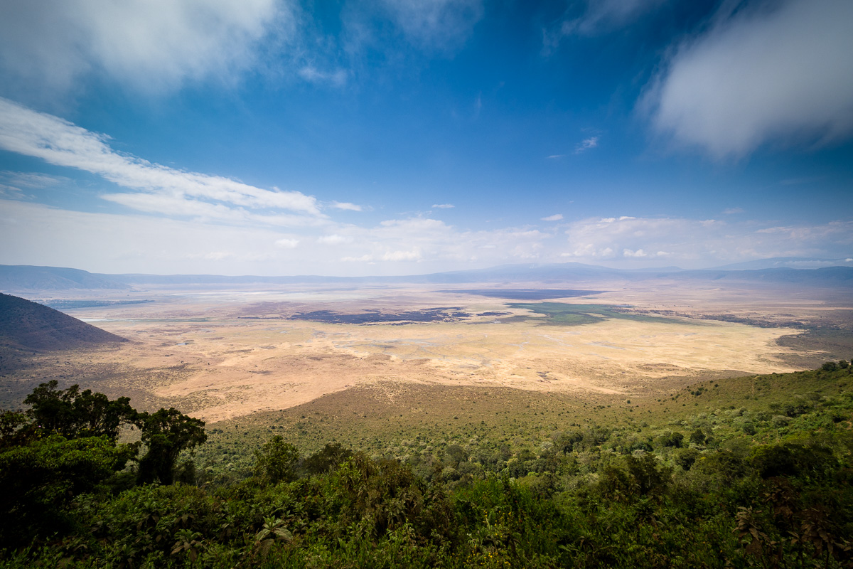 327. Po dużych i mało miłych przygodach podczas przelotu do Tanzanii z kilkugodzinnym opóźnieniem dojechaliśmy do krateru Ngorongoro. To właściwie nie jest krater a kaldera czyli zapadły wulkan. Wewnątrz tej ogromnej przestrzeni żyją niemal wszystkie duże zwierzęta Afryki - wyjątkiem jest żyrafa, dla której zbocza kaldery są zbyt strome do pokonania. Poniżej na zdjęciu widok z krawędzi tejże kaldery na Park Narodowy Ngorongoro