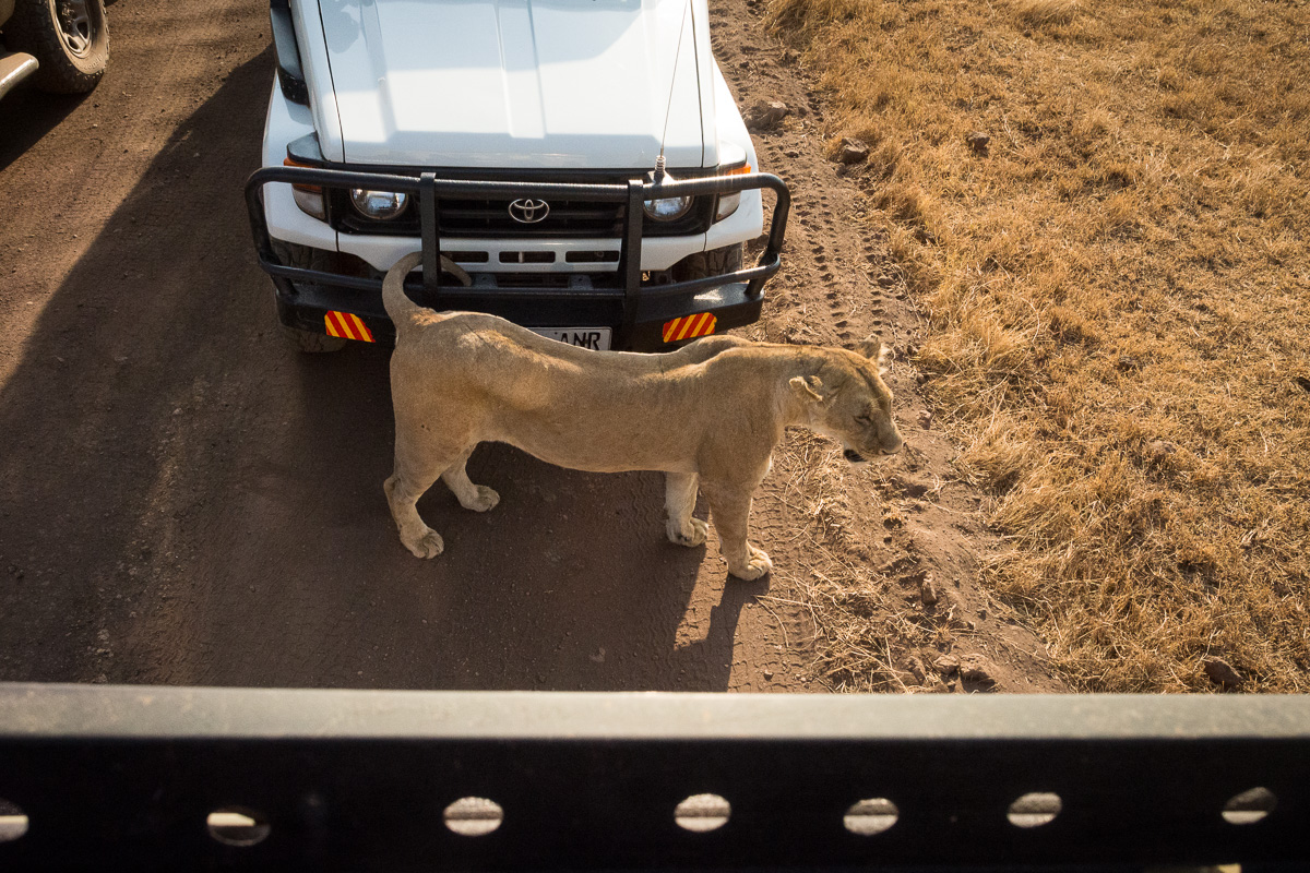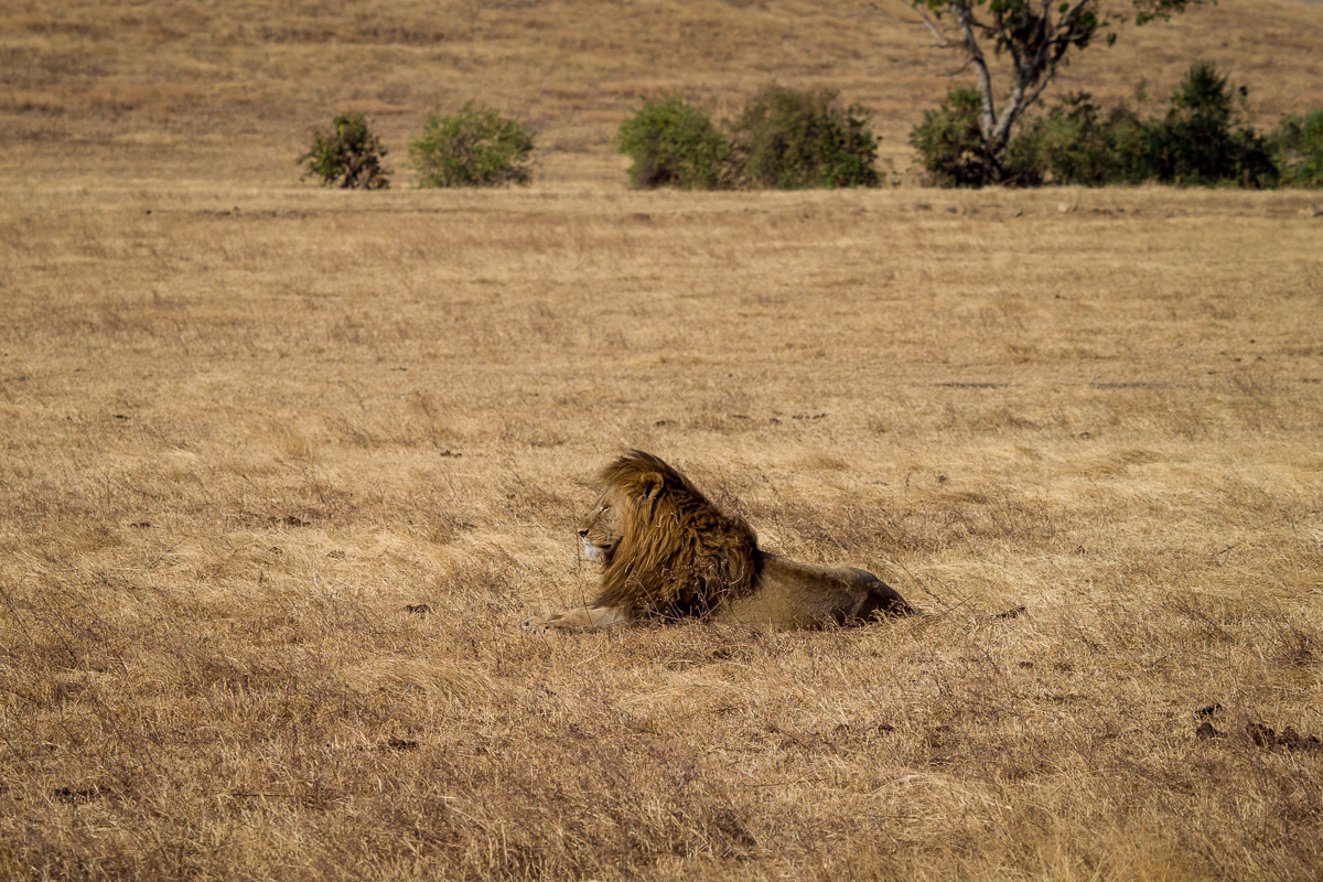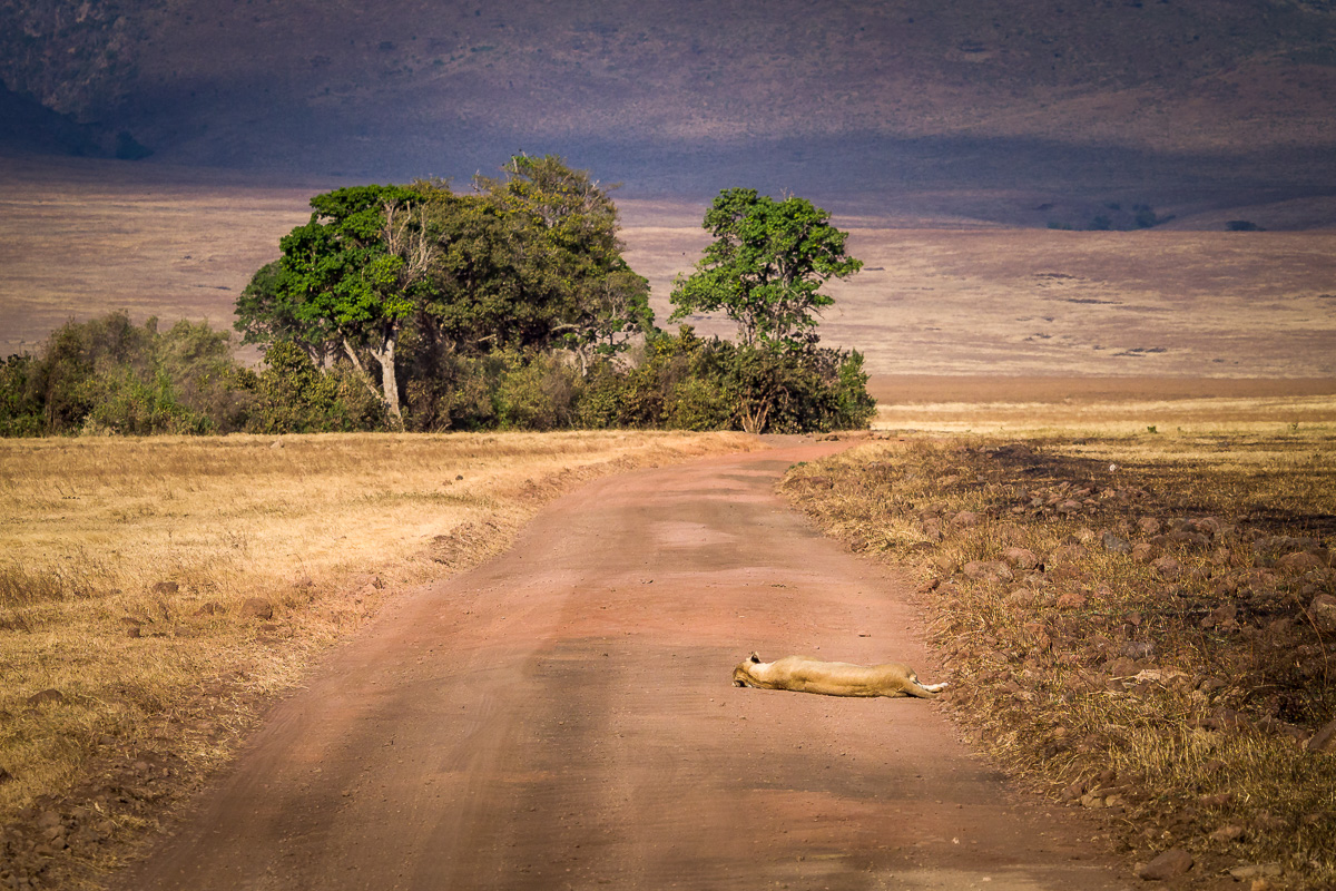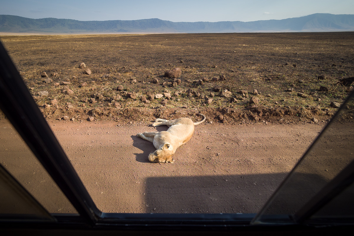 328. Podczas poprzedniej podróży widzieliśmy tylko dwie lwice i niestety nie udało nam się zaobserwować żadnego lwa. Po zjechaniu na dno kaldery naszym oczom ukazał się poniższy obrazek. Wyglądało na to, że to leży lwica potrącona przez jeepa z turystami.