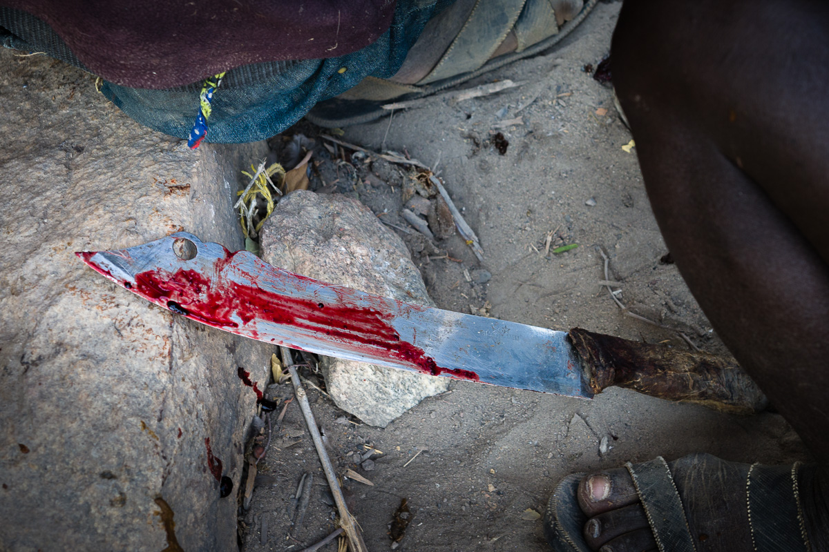 279. Nie minęło kilka chwil a mała antylopa została pozbawiona skóry i wnętrzności. Zwróćcie uwagę w sąsiedztwie czego leży to mięso.