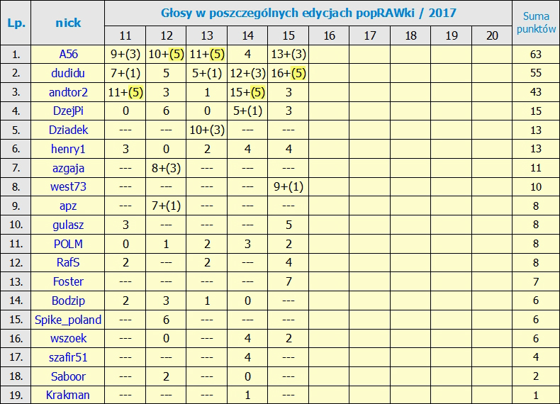 RANKING po 15 edycji. Punkty wynikają z ilości głosów jaką praca otrzymała w głosowaniu.