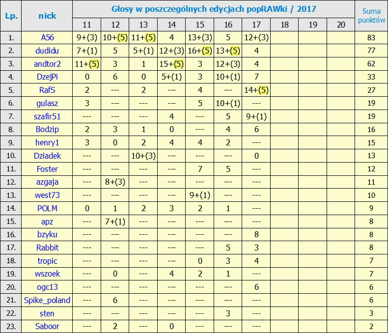 RANKING po 17 edycji. Punkty wynikają z ilości głosów jaką praca otrzymała w głosowaniu.
