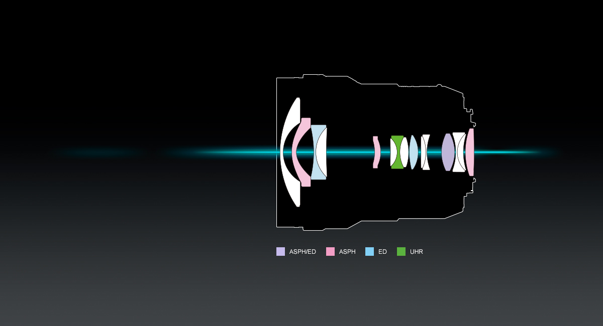 - Budowa obiektywu 15 elementów w 10 grupach (1 soczewka asferyczna ED, 3 soczewki asferyczne, 2 soczewki ED, 1 soczewka UHR)