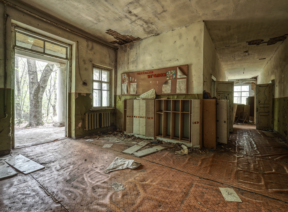 Tak też było w tym przedszkolu, gdzie ściany przybierały różne odcienie zieleni. to akurat sala do leżakowania. Porozrzucane zabawki robią ogromne wrażenie. Jednak nie dajmy się zwieźć, większość z nich poprzynosili stalkerzy i poukładali je do swoich zdjęć i filmów. to nie jest tak że wszystkie porzucone rzeczy w strefie pamiętają moment wybuchu. Ktoś tam dba o to byśmy tak myśleli i by eksploracja była bardziej dramatyczna. Będzie to widac na innych zdjęciach gdzie ilośc masek przeciwgazowych oraz książek komunistycznych jest większa niż w muzeum komunizmu w Moskwie.