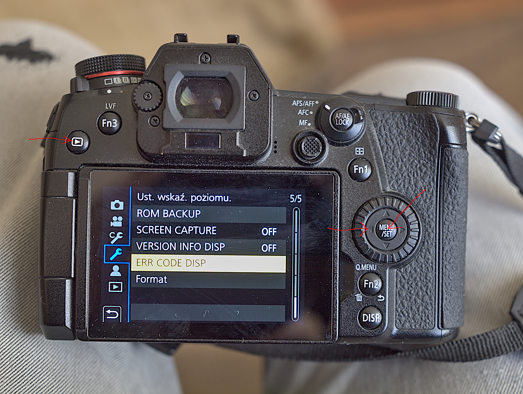 - naciskamy player (odtwarzacz/podgląd) oraz AF/AE Lock. Przytrzymujemy razem oba klawisze i włączamy aparat.