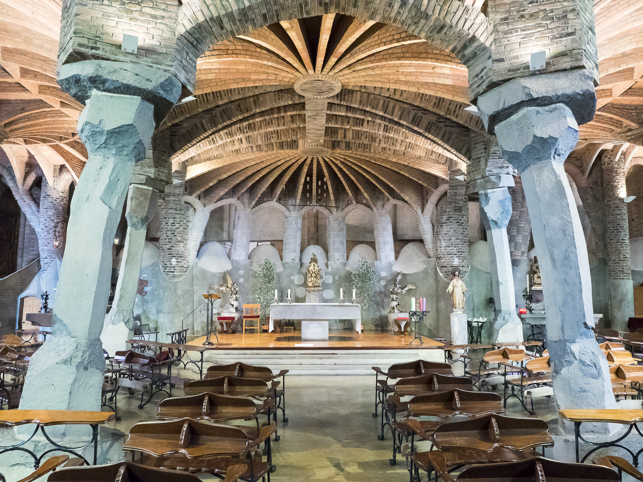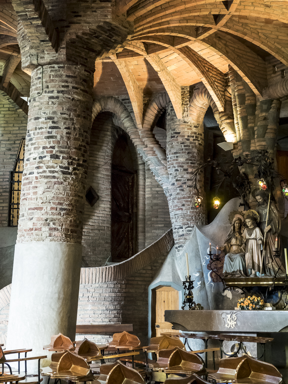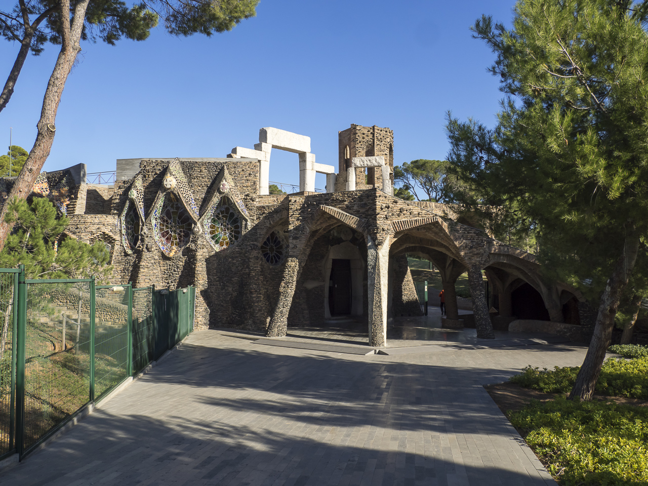Antoni Gaudí chciał aby kościół wtopił się w otoczenie. Nadał mu szaro-brązową barwę, co powoduje jego stopienie się ze wzgórzem, na którym stoi. Kolumnom zewnętrznym starał się nadać kształt rosnących pni, natomiast sufity pomiędzy nimi zamalował na barwę niebiesko-białą, co miało stanowić aluzję do nieba. Gaudí zawarł tym sposobem swój pogląd na "drogę" chrześcijanina. W środkowej części krypty na uwagę zasługuje sklepienie, stylizowane na kształty wyrzeźbione przez naturę - daje to efekt prawdziwej groty. Potęgują go jeszcze specjalnie obłupane pochylone kolumny i ściany.
