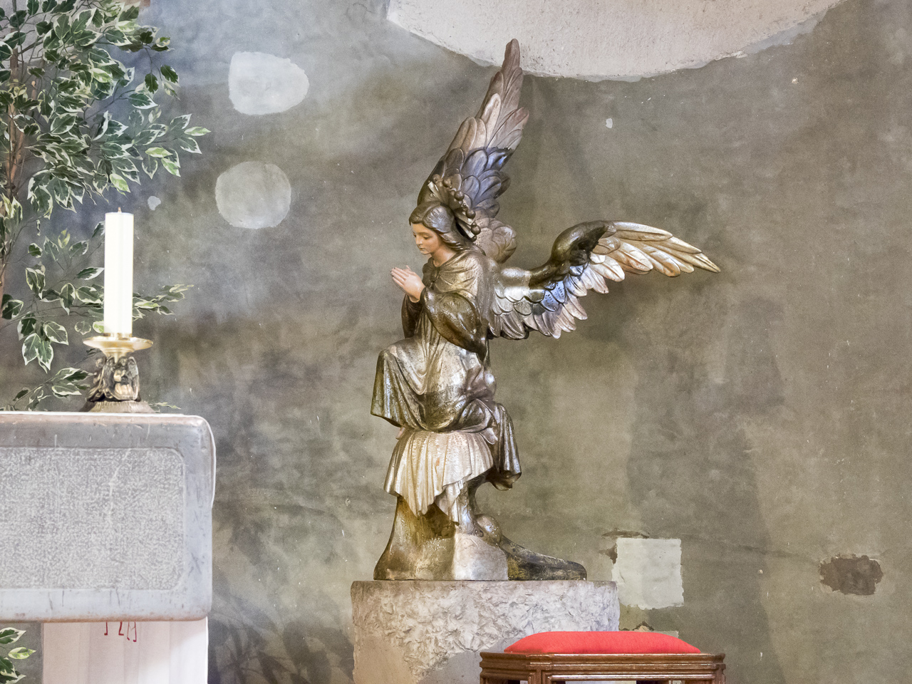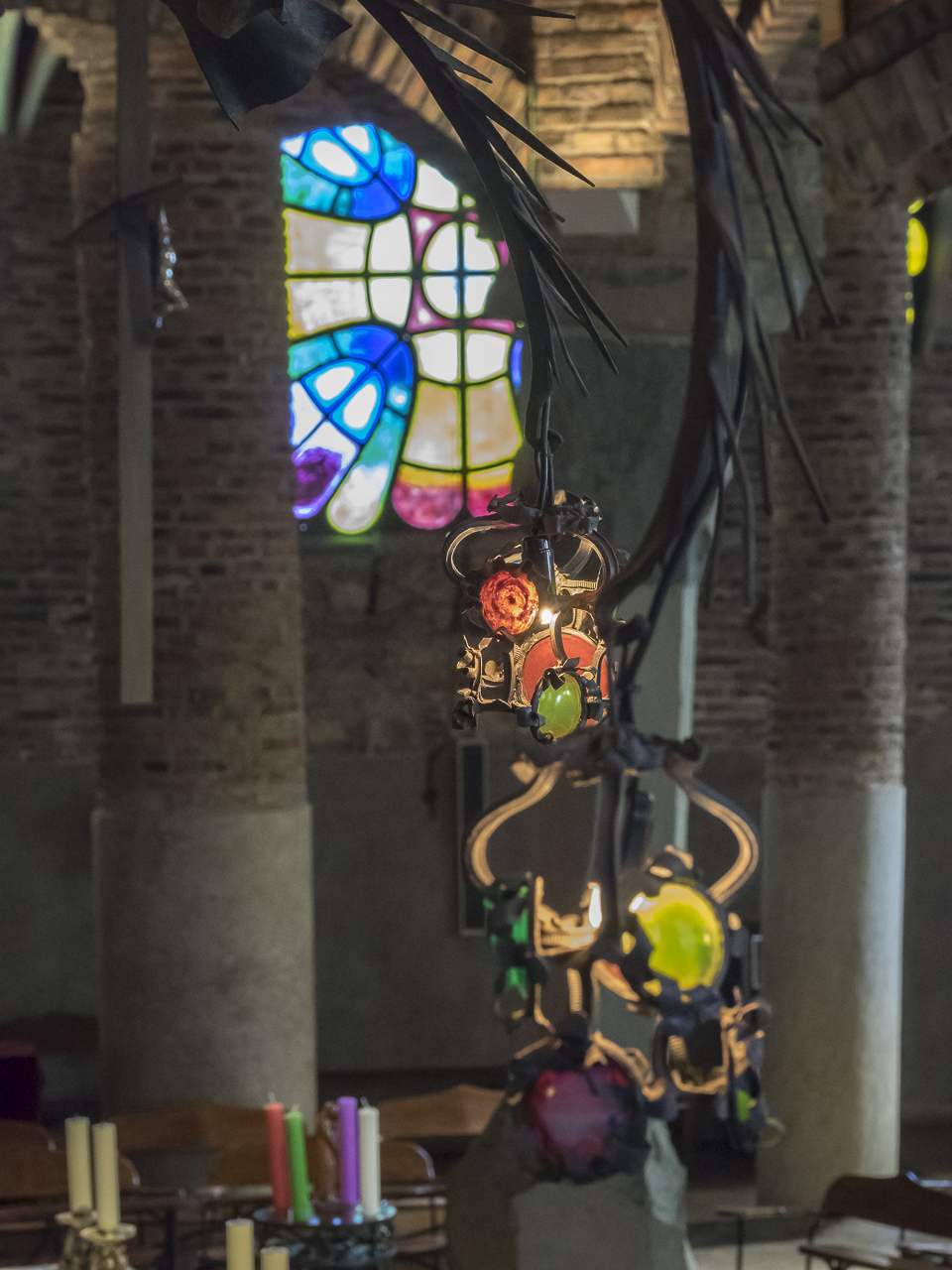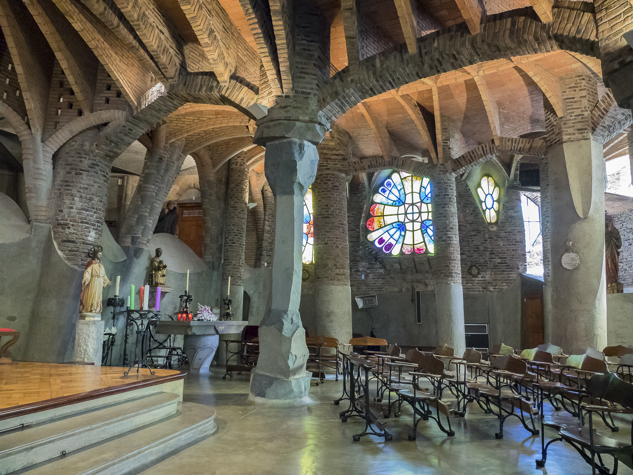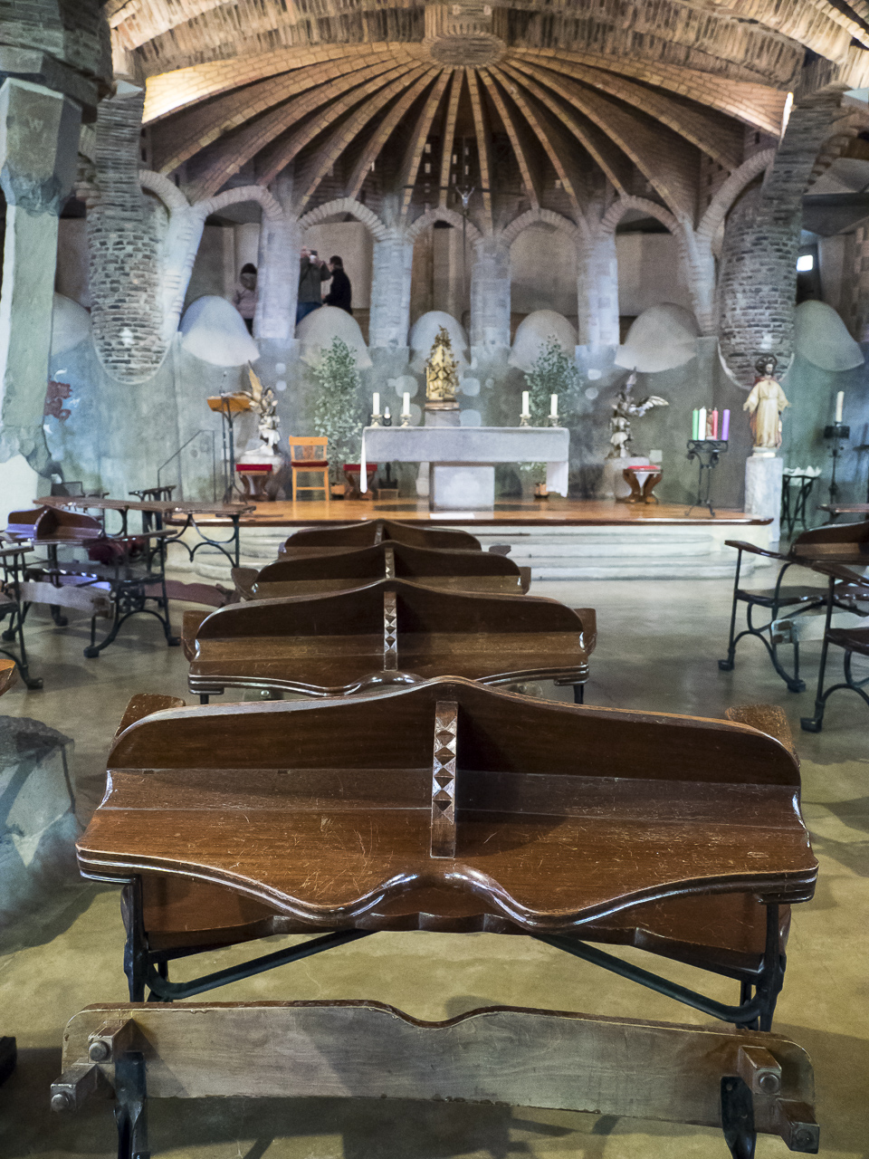 Antoni Gaudí chciał aby kościół wtopił się w otoczenie. Nadał mu szaro-brązową barwę, co powoduje jego stopienie się ze wzgórzem, na którym stoi. Kolumnom zewnętrznym starał się nadać kształt rosnących pni, natomiast sufity pomiędzy nimi zamalował na barwę niebiesko-białą, co miało stanowić aluzję do nieba. Gaudí zawarł tym sposobem swój pogląd na "drogę" chrześcijanina. W środkowej części krypty na uwagę zasługuje sklepienie, stylizowane na kształty wyrzeźbione przez naturę - daje to efekt prawdziwej groty. Potęgują go jeszcze specjalnie obłupane pochylone kolumny i ściany.