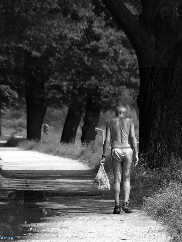 84 starszy pan, ewidentnie zrobiło mu się za gorąco, skoro ciuchy zapakował do torby ze sklepu z kropkowanym owadem