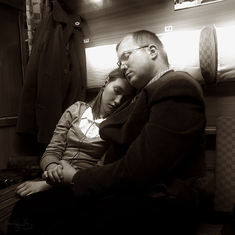 Unikalna sprawa, klimat pociągowej podróży, dwoje ludzi bardzo razem, piękna twarzyczka dziewczyny, niewinna, jak na romantycznych obrazkach. Wykorzystane światełko zastane.